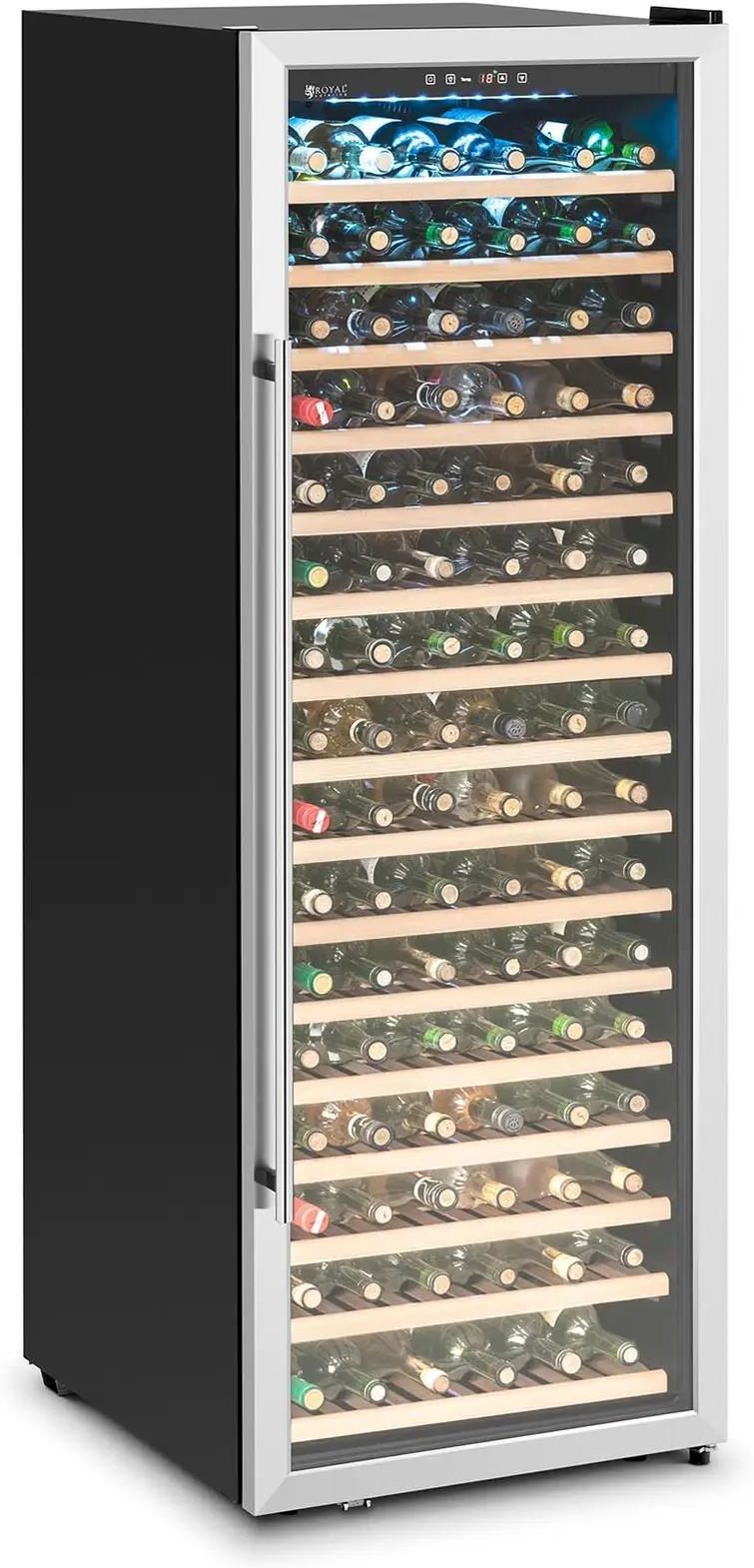 W wolnostojącej lodówce do wina od Royal Catering możesz schłodzić i zaprezentować soki, wodę, napoje bezalkoholowe, alkohole itp. Subtelne oświetlenie LED i elegancki, matowy czarny design sprawdzi się w restauracjach, na stacjach benzynowych, eventach, stoiskach wystawienniczych, w barach czy w biurze. Oczywiście możesz również korzystać ze sprzętu podczas prywatnych imprez z przyjaciółmi. Dzięki poziomowi hałasu 40 dB urządzenie jest ledwo słyszalne i należy do najcichszych chłodziarek do napojów na rynku – idealne do użytku w strefie klienta. W ciemniejszym otoczeniu nastrojowe oświetlenie LED zapewnia przyjemną atmosferę i atrakcyjną prezentację produktów. Dzięki pojemności 428 l i 16 półkom o regulowanej wysokości chłodziarka do napojów oferuje wystarczająco dużo miejsca na przechowywanie butelek o różnych rozmiarach. Poziomy mogą pomieścić do 199 standardowych butelek z napojami. Model z łatwością poradzi sobie z nierównymi podłogami, ponieważ nóżki można regulować o 15 mm i dostosować do powierzchni. Oznacza to, że lodówka do wina jest stabilna. Wewnętrzna obudowa wykonana ze stali nierdzewnej jest bardzo łatwa do czyszczenia, jeśli jest zabrudzona rozlanymi napojami itp. Stal malowana proszkowo jako zewnętrzna obudowa nie tylko zapewnia estetyczny wygląd, ale również niezawodnie chroni urządzenie chłodzące przed korozją. Drzwi z dwuwarstowego szkła hartowanego wyraźnie prezentują napoje i alkohol, a jednocześnie zapewniają stałą temperaturę. Nawet w gorące letnie dni lodówka na napoje chłodzi butelki do 5-18°C. Przyjazny dla środowiska czynnik chłodniczy R600A (izobutan) jest obecnie jednym z najczęściej stosowanych chłodziw w sektorze prywatnym i komercyjnym ze względu na jego niski wpływ na efekt cieplarniany. Nie ma negatywnego wpływu na warstwę ozonową. Jego cechą charakterystyczną jest wysoka wydajność chłodzenia przy niskim zużyciu energii. Regulacja – ustawiana temperatura 5-18°C Cicha praca – z głośnością zaledwie 40 dB jest to jedna z najcichszych lodówek do napojów na rynku Możliwość dostosowania – dzięki nóżkom o regulowanej wysokości może bezpiecznie stać na nierównej podłodze Ekonomia – szklane drzwi z dwuwarstwowego szkła hartowanego i przyjazny dla klimatu czynnik chłodniczy R600A zapewniają stałą temperaturę Szlachetność – stal malowana proszkowo w kolorze czarnym i światło LED tworzą przyjemną atmosferę Pojemność: 428 l Moc: 120 W 16 półek Poziom hałasu: 40 dB Zakres temperatury 5-18°C