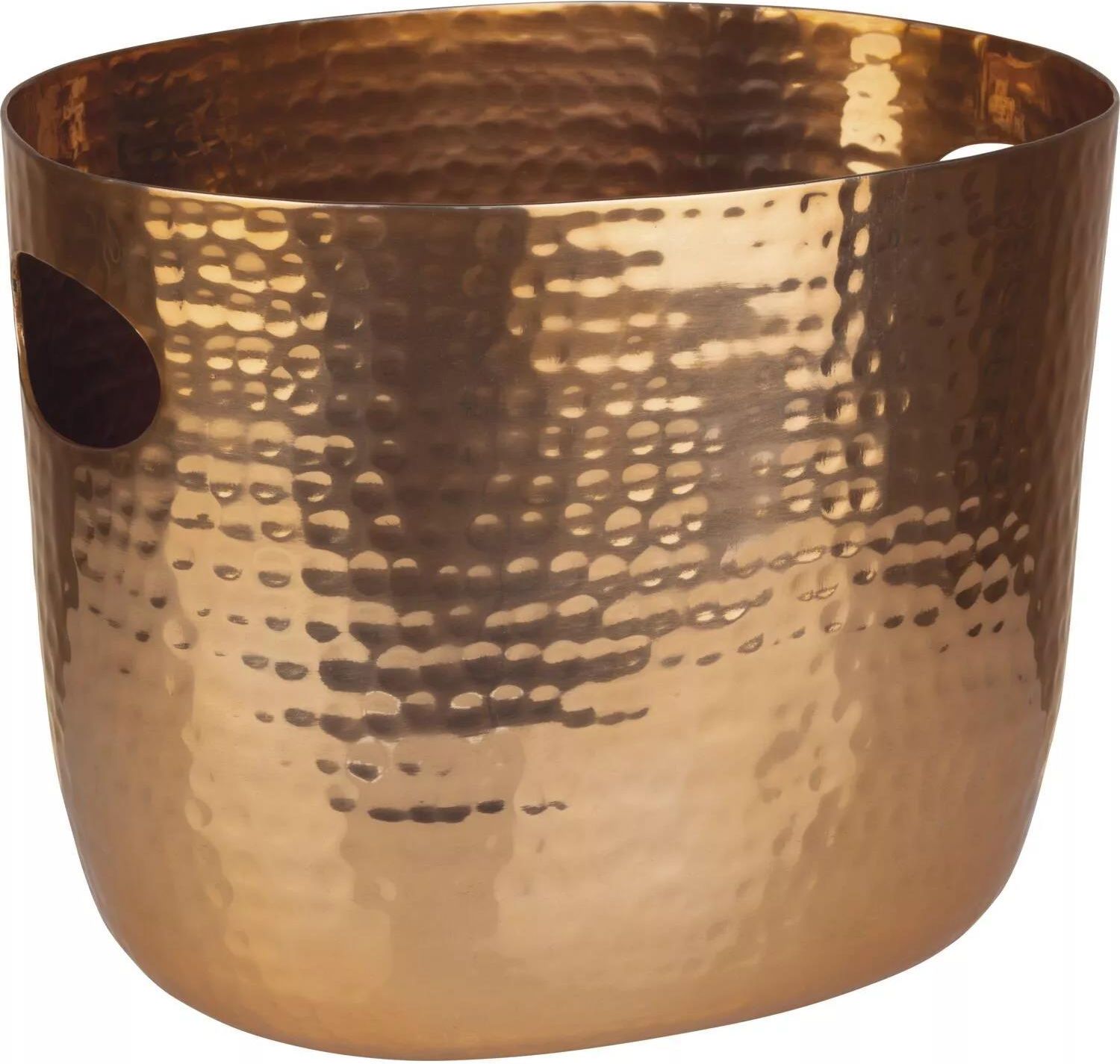 Schładzacz do butelek z uchwytami, kolor miedziany, 3.9 l APS 36108 Schładzacz do butelek z uchwytami to elegancki i funkcjonalny pojemnik idealny do podawania schłodzonych win lub szampana podczas przyjęć, uroczystości czy spotkań towarzyskich. Charakteryzuje się efektownym, miedzianym wykończeniem, imitującym młotkowaną powierzchnię oraz wygodnymi bocznymi uchwytami. Pozwala na prezentację i serwowanie trunków w stylowy sposób, dbając jednocześnie o ich odpowiednią temperaturę. Cechy charakterystyczne Miedziane wykończenie – stylowa imitacja miedzi sprawia, że schładzacz doskonale prezentuje się na stole i przyciąga wzrok gości. Młotkowana powierzchnia – oryginalna tekstura dodaje charakteru i podkreśla wysoką jakość wykonania produktu. Praktyczne uchwyty – dwa boczne uchwyty zapewniają wygodne przenoszenie schładzacza, nawet gdy jest wypełniony lodem i butelkami. Specyfikacja produktu Wymiary: 25,5 x 19 cm – pozwalają na umieszczenie kilku butelek jednocześnie. Wysokość: 20 cm – ułatwia schładzanie zarówno standardowych, jak i większych butelek. Pojemność: 3,9 l – wystarczająca do obsługi większych spotkań i przyjęć. Materiał: aluminium – lekki, trwały i odporny na korozję, gwarantujący długie użytkowanie. Kolor: miedziany – podkreśla elegancki wygląd produktu. Zastosowanie produktu Schładzacz do butelek z uchwytami sprawdzi się doskonale podczas eleganckich przyjęć, bankietów, wesel oraz spotkań rodzinnych i towarzyskich. Umożliwia efektowne serwowanie win i szampanów, zapewniając im odpowiednią temperaturę przez długi czas. Dzięki solidnej konstrukcji i wygodnym uchwytom jest łatwy w przenoszeniu – zarówno w domu, jak i w restauracji czy hotelu. Budowa i wykonanie Produkt wykonany jest z wysokiej jakości aluminium, które zostało dodatkowo wykończone na kolor miedziany z charakterystyczną młotkowaną fakturą. Konstrukcja została zaprojektowana tak, by zapewnić maksymalną funkcjonalność i estetyczny wygląd. Boczne uchwyty umożliwiają bezpieczne i wygodne przenoszenie, nawet przy pełnym wypełnieniu lodem i butelkami. Podsumowanie Schładzacz do butelek z uchwytami w kolorze miedzianym to połączenie stylu, trwałości i praktyczności, które sprawdzi się w każdej sytuacji wymagającej eleganckiego serwowania napojów. Odporny na uszkodzenia, łatwy w obsłudze i wyjątkowo estetyczny, będzie świetnym wyborem dla osób ceniących wysoką jakość oraz efektowny wygląd podczas serwowania trunków.