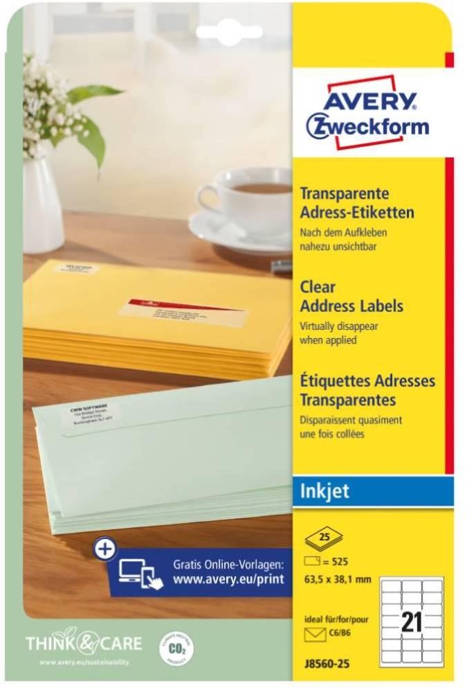 Etykiety adresowe do drukarek atramentowych Avery Zweckform, 63,5x38,1mm, 25 arkuszy, przezroczysty Avery Zweckform Przezroczyste, poliestrowe etykiety, które „znikają” po naklejeniu na białą, kolorową lub fakturowaną powierzchnię. Natychmiastowe wysychanie bez rozmazywania zaraz po wyjściu z …