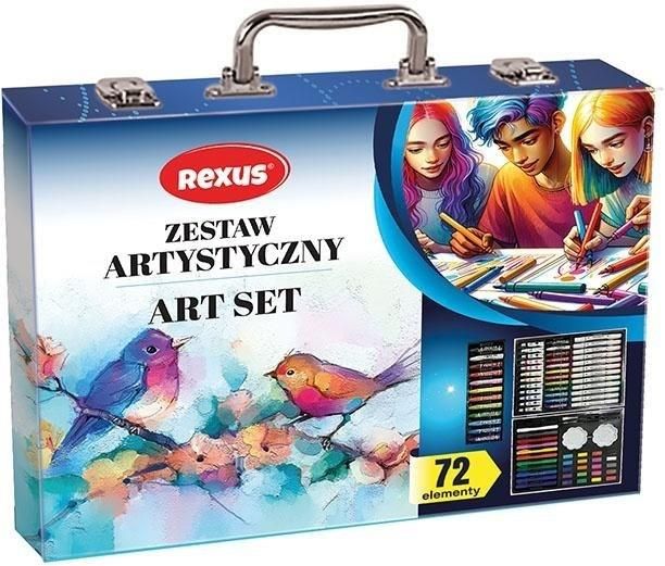 Zestaw artystyczny zawiera 72 elementy. W jego skład wchodzi: 20 farb akwarelowych, 12 wykręcanych kredek, 12 flamastrów akwarelowych, 12 pasteli olejnych, 12 mazaków, 2 pędzelki, 1 paletka EAN: 5904441142839