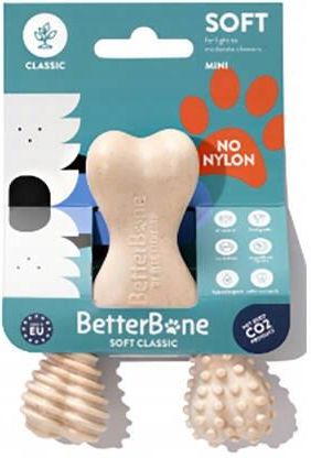 BetterBone Classic - gryzak dla małych psów o małej twardości Innowacyjne kości do żucia dla psów Szukasz zdrowej i trwałej zabawki do gryzienia dla swojego pupila? Poznaj BetterBone Classic, nowy standard wśród zabawek do żucia dla psów! Wykonana z naturalnych, hipoalergicznych składników, takich jak celuloza i olej roślinny jakości spożywczej, kość jest bezpieczna, trwała i atrakcyjna dla psów każdej rasy. Kości BetterBone MINI przeznaczone są dla psów do 7 kg, a dzięki twardości SOFT sprawdzą się u psów o małej intensywności żucia. Bezpieczeństwo i skład Kości BetterBone zostały zaprojektowane z myślą o maksymalnym bezpieczeństwie psa. Łuszczą się, a nie odpryskują, co minimalizuje ryzyko zadławienia lub zranienia. Produkt jest w 100% naturalny, bez GMO, nylonu i sztucznych dodatków, dzięki czemu jest bezpieczny nawet dla psów z alergiami lub nietolerancjami pokarmowymi. Skład oparty na celulozie i oleju roślinnym sprawia, że kość może być bezpiecznie spożywana w niewielkich ilościach. Wytrzymałość i funkcjonalność Chociaż kość jest wykonana z naturalnych składników, jest trwała i zapewnia długą zabawę dla psa, wspierając jego aktywność fizyczną i psychiczną. Wsparcie dla higieny jamy ustnej Regularne gryzienie kości BetterBone pomaga w mechanicznej redukcji osadu i kamienia nazębnego, wspierając zdrowie zębów i dziąseł psa. Różnorodne tekstury i ergonomiczny design Kość posiada trzy końcówki o różnych teksturach, które stymulują zmysły psa i wspomagają mechaniczne czyszczenie zębów. Konstrukcja została dopasowana do łapy psa, co ułatwia chwytanie i żucie, zwiększając komfort zabawy. Ekologiczna produkcja BetterBone jest produkowany w Europie, zgodnie z surowymi normami UE, bez użycia szkodliwych chemikaliów – nie zawiera ftalanów, parabenów, BPA ani substancji rakotwórczych i mutagenów. Produkt jest biodegradowalny, co wyróżnia go na tle nylonowych kości konkurencji. Naturalny wybór i innowacyjność BetterBone łączy potrzeby psów z ekologicznym trendem – jest bezpieczny, hipoalergiczny, przyjazny środowisku i atrakcyjny dla klientów szukających naturalnych produktów. Dostępne stopnie twardości Soft – dla szczeniąt, starszych psów i psów z wrażliwymi zębami Medium – dla psów o średniej intensywności żucia Hard – dla psów, które żują z dużą intensywnością Dostępne wielkości Mini – dla psów do 7 kg Small – dla psów do 18 kg Large – dla psów powyżej 18 kg Dostępne smaki Classic – hipoalergiczny, niearomatyzowany Beef – 100% prawdziwej, odwodnionej wołowiny, bez sztucznych aromatów