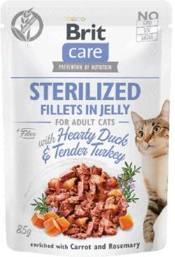 Brit Care Cat Pouch STERILISED Fillets in Jelly with Hearty Duck & Tender Turkey enriched with Carrot & Rosemary to karma pełnoporcjowa, mokra, bezzbozowa, Super Premium dla dorosłych kotów sterylizowanych. Profilaktyka przez żywienie - to główna zasada, którą spełniają starannie skomponowane karmy …