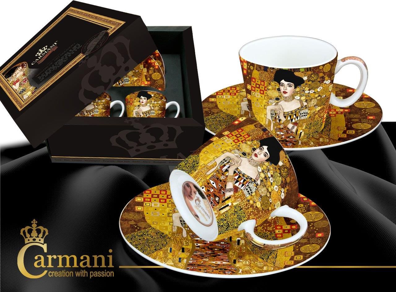 Serdecznie witamy :-) Przedstawiamy... ...Carmani, 2x filiżanka-espresso GUSTAV KLIMT/Adele Bloch-Bauer Dwie, małe, porcelanowe filiżanki-espresso ze spodeczkiem o tradycyjnym, rozszerzającym się ku górze kształcie i wyraźnym, bez złoceń, kolorowym motywie na swojej powierzchni w postaci …