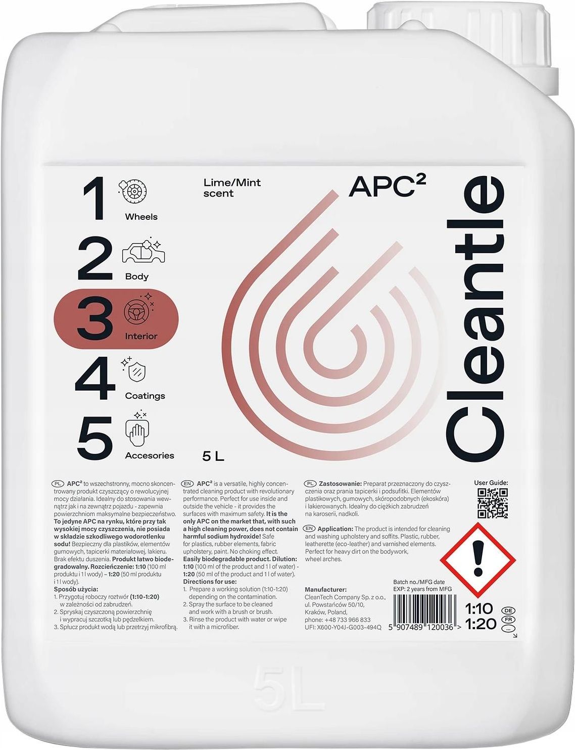 ✔️Cleantle APC2 – to rewolucyjny środek o wszechstronnym zastosowaniu, który doskonale nadaje się do czyszczenia wewnętrznych i zewnętrznych powierzchni samochodu. Jest to pierwsze APC na rynku pozbawione szkodliwego wodorotlenku sodu, a także charakteryzujące się silnie skoncentrowaną formułą i wysoką mocą czyszczenia. Produkt można stosować do czyszczenia elementów plastikowych, winylowych, tapicerek materiałowych, karoserii i felg. Świetnie sprawdza się podczas czyszczenia komory silnika. Pomimo swojego silnego i skutecznego działania jest bezpieczny dla wszystkich czyszczonych powierzchni. Nie wywołuje efektu duszenia. Produkt jest łatwo biodegradowalny. Najważniejsze cechy: brak szkodliwego wodorotlenku sodu, maksymalne bezpieczeństwo – nie uszkadza materiałów nawet po zaschnięciu, wysoka moc czyszczenia, nie wywołuje efektu „duszenia”, silnie skoncentrowany, łatwo biodegradowalny, zapach limonki z miętą. Zalecane rozcieńczenie: 1:10 (100ml produktu i 1l wody), 1:20 (50ml produktu i 1l wody).