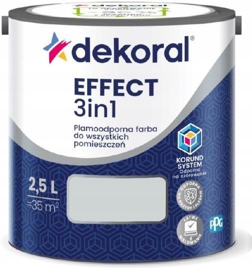 Dekoral Effect 3In1 farba plamoodporna Szary Jasny 2,5l Farba plamoodporna rekomendowana do malowania wszystkich pomieszczeń np. sypialnii, salonu czy pokoju dziecięcego. Posiada odporność na zmywanie i szorowanie - bez zacieków. Farba silnie kryje, doskonale się rozprowadza i nie chlapie. Powłoka …