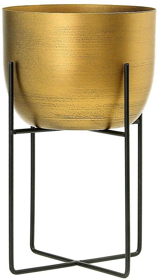 Stylowy kwietnik wykonany z metalu. Składa się z eleganckiej donicy złotym w kolorze i czarnej podstawy-stojaka. Modna dekoracja o ciekawym designie, która pomoże Ci wyeksponować ulubione kwiaty i wniesie do wnętrza odrobinę blasku.
