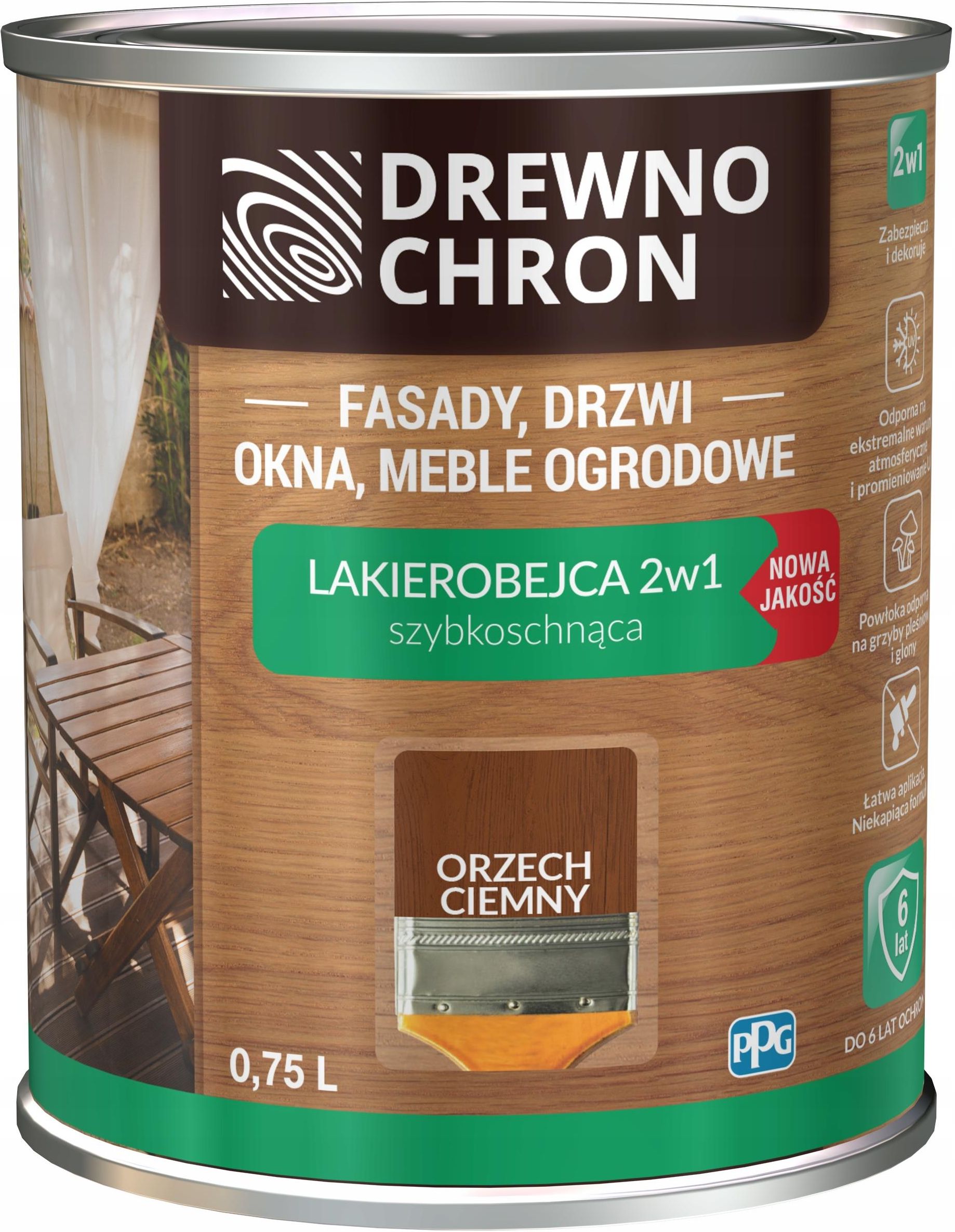 Lakierobejca 2w1 Nowa Jakość Pojemność: 0,75L | Wydajność: do 14 m2/l | Kolor: orzech ciemny _ Dane techniczne: Wydajność: do 14m2/l przy jednej warstwie Zalecana ilość warstw: 1-2 Najważniejsze zalety: 2 w 1 impregnuje i dekoruje przyjemne, łatwe malowanie odporna na działanie promieni UV odporna na zmienne warunki atmosferyczne podkreśla naturalne usłojenie drewna do wnętrz i na zewnątrz pachnie lasem podczas malowania do 6 lat ochrony powłoki dla powierzchni pionowych, w zależności od warunków eksploatacji Transparentna lakierobejca nadaje eleganckie, satynowe wykończenie, podkreślając naturalne usłojenie drewna. Na zewnątrz: podbitki, płoty, meble ogrodowe, drzwi, okna, elewacje drewniane, altanki, domki letniskowe. Wewnąrz: drzwi, okna, boazerie.  Sposób stosowania: Przygotowanie podłoża Podłoże wyrównaj, przeszlifuj, odpyl, odtłuść wodnym roztworem detergentu (detergent po zastosowaniu usuń wilgotną szmatką). Z powierzchni uprzednio malowanych usuń złuszczenia, przeszlifuj i odpyl.   Powierzchnia powinna być czysta i sucha. Przedmioty eksploatowane na zewnątrz pomieszczeń (uprzednio nie malowane) zaimpregnuj Impregnatem Grunt R lub Impregnatem Extra bezbarwnym marki Drewnochron   Wewnątrz pomieszczeń surowe drewno zagruntuj Lakierobejcą 2 w 1 z dodatkiem 20% wody Lakierowanie Lakierobejcę przed użyciem dokładnie wymieszaj.  Wewnątrz pomieszeń nałóż 1-2 warstwy wyrobu w zależności od oczekiwanego efektu dekoracyjnego. Na zewnątrz należy nanieść min. 2 warstwy. Pomiędzy warstwami zachować przerwę 2 godzin. Pełne wyschnięcie powłoki uzyskuje się po 4 godzinach. Niska temperatura i wysoka wilgotność wydłuża czas schnięcia. Dla uzyskania lepszego efektu dekoracyjnego poprzednią warstwę przeszlifuj drobnoziarnistym papierem ściernym i usuń pył. Narzędzia należy myć w wodzie. Unikać uwolnienia do środowiska. Zawartość pojemnika jak i pojemnik utylizować zgodnie z lokalnymi, regionalnymi, narodowymi oraz międzynarodowymi przepisami. Nie wdychać rozpylonej cieczy. W przypadku niedostatecznej wentylacji stosować indywidualne środki ochrony dróg oddechowych. Zawiera mieszanina poreakcyjna 5-chloro-2-metylo-2H-izotiazol-3-onu i 2-metylo-2H-izotiazol-3-onu (3:1) i 1,2-benzoizotiazol-3(2H)-on. Może powodować wystąpienie reakcji alergicznej. .lnd_object .lnd_text .lnd_content { font-size: 16px; }