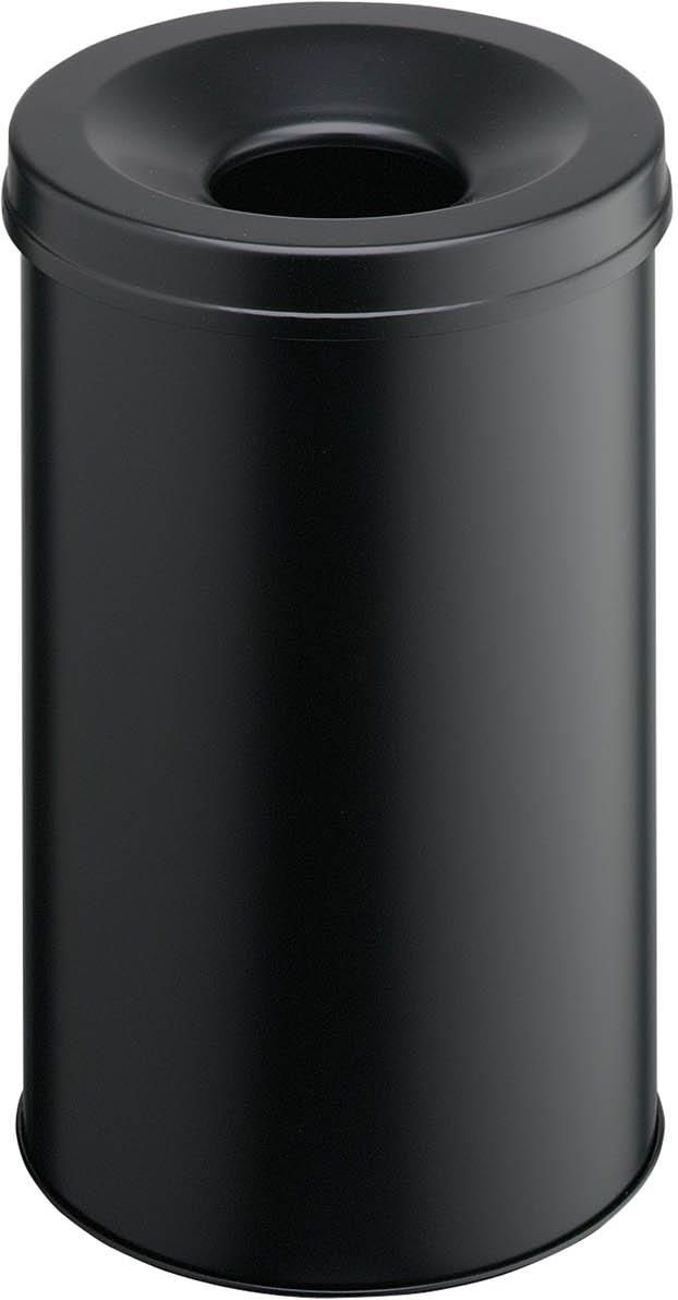 Bezpieczny kosz na śmieci z samogaszącą ogień pokrywą Okrągły kosz na papier z głowicą gaśniczą (ochrona przeciwpożarowa) Samogasząca pokrywa głowicy gaśniczej odcina dostęp tlenu i tym samym gasi ogień Z certyfikatem TÜV-GS określający bezpieczeństwo do pobrania tutaj , Blue Angel, 100% zdatność do recyklingu Ze stali i odporną na zadrapania powłoką z żywicy epoksydowej Pojemność 30 litrów