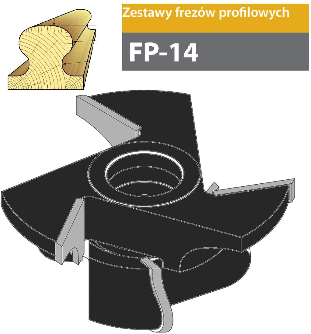 Zestaw frezów nasadzanych, profilowych typ FP-14 z trzema ostrzami skrawającymi, przeznaczony do profesjonalnej obróbki drewna litego. Zestaw zaprojektowany do profilowania powierzchni podczas produkcji poręczy szynowych. Zestaw dwóch frezów profilowych do poręczy Wyposażone w ostrza wykonane z najwyższej jakości stali szybkotnącej HSS, przeznaczonej do obróbki drewna litego Frez nr. 1: Średnica zew.: 160 mm, Średnica wew.: 30 mm, Wysokość: 35 mm Frez nr. 2: Średnica zew.: 118 mm, Średnica wew.: 30 mm, Wysokość: 41 mm Komplet składa się z: Dwóch frezów profilowych, dwóch przekładek dystansowych 3 mm Materiał: HSS Obróbka: Drewno miękkie