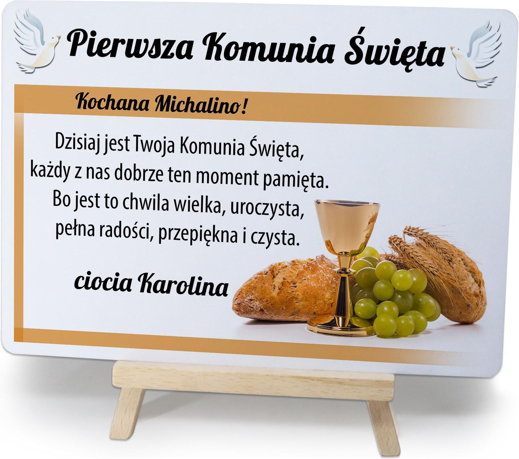 Personalizowana Pamiątka I Komunii Świętej na drewnianej sztaludze Dane techniczne: Rozmiar: 14x10 lub 20x14 cm + wysokość sztalugi Kształt: Prostokąt Grubość: 3mm, Materiał: metal, papier, drewno (sztaluga) Nadruk: pełnokolorowy, niewyczuwalny w dotyku Wyjątkowej urody pamiątka I Komunii Świętej jest naszym autorskim produktem. Pełnokolorowy personalizowany nadruk umieszczany na sztywnym metalowym elemencie idealnie komponuje się z drewnianą sztalugą, na której jest osadzany. Taki zestaw to idealny pomysł na prezent! Sprawdź koniecznie naszą ofertę, na pewno wybierzesz odpowiedni wzór i sprawisz niezapomniany oraz praktyczny prezent bliskiej Ci osobie. A może też znajdziesz coś dla siebie :)