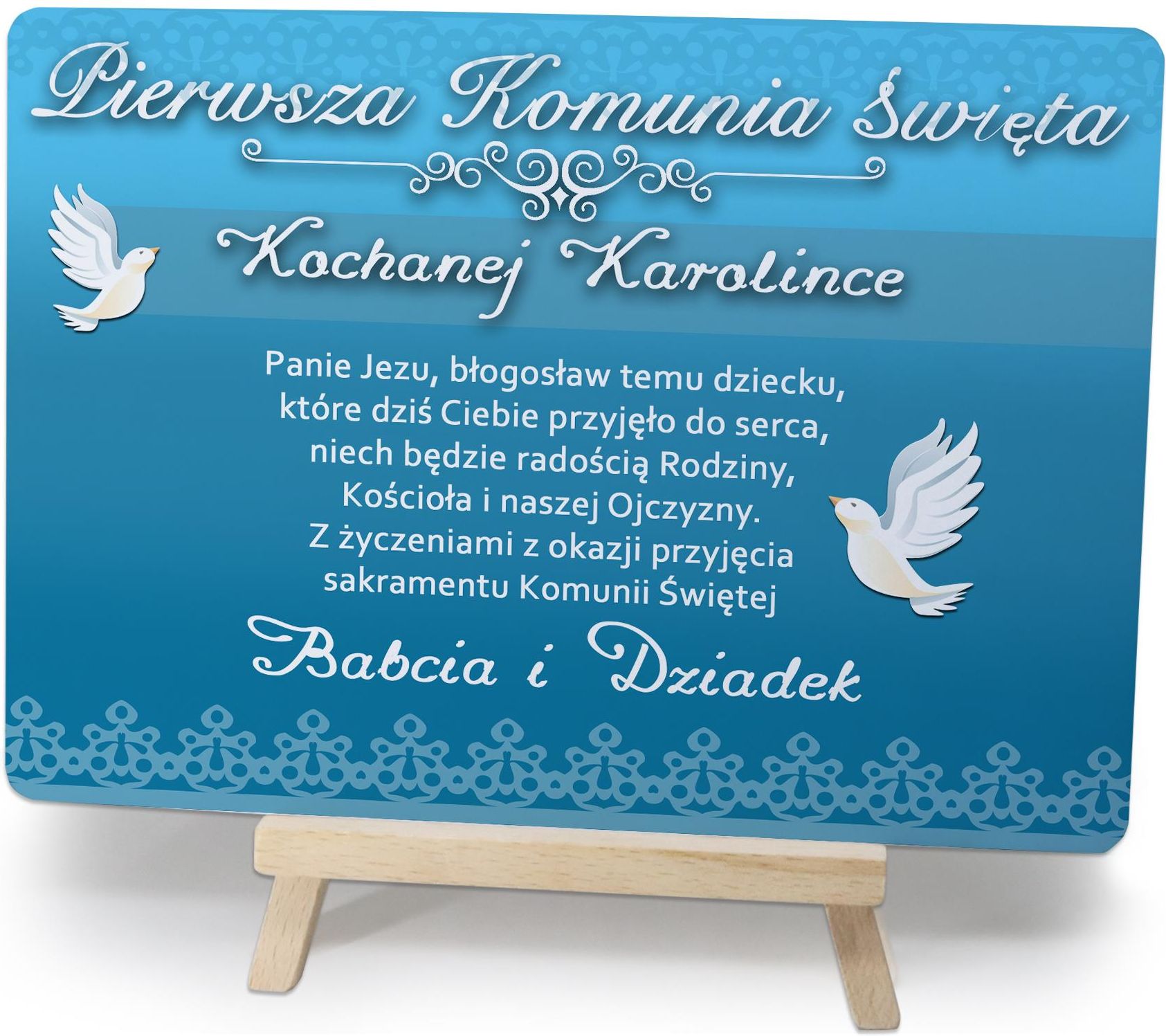 Personalizowana Pamiątka I Komunii Świętej na drewnianej sztaludze Dane techniczne: Rozmiar: 14x10 lub 20x14 cm + wysokość sztalugi Kształt: Prostokąt Grubość: 3mm, Materiał: metal, papier, drewno (sztaluga) Nadruk: pełnokolorowy, niewyczuwalny w dotyku Wyjątkowej urody pamiątka I Komunii Świętej …