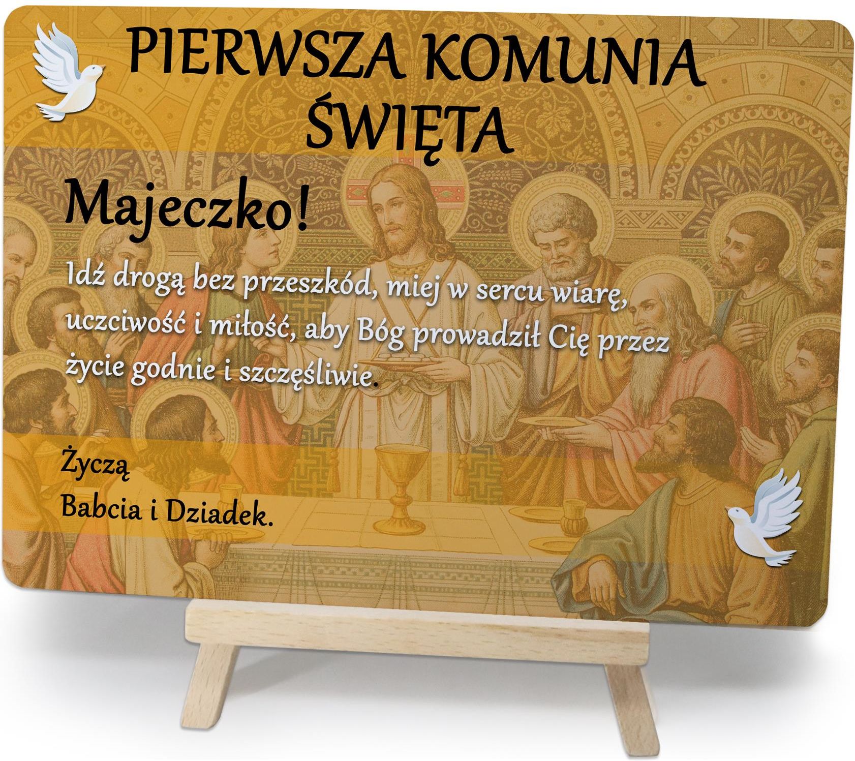 Personalizowana Pamiątka I Komunii Świętej na drewnianej sztaludze Dane techniczne: Rozmiar: 14x10 lub 20x14 cm + wysokość sztalugi Kształt: Prostokąt Grubość: 3mm, Materiał: metal, papier, drewno (sztaluga) Nadruk: pełnokolorowy, niewyczuwalny w dotyku Wyjątkowej urody pamiątka I Komunii Świętej jest naszym autorskim produktem. Pełnokolorowy personalizowany nadruk umieszczany na sztywnym metalowym elemencie idealnie komponuje się z drewnianą sztalugą, na której jest osadzany. Taki zestaw to idealny pomysł na prezent! Sprawdź koniecznie naszą ofertę, na pewno wybierzesz odpowiedni wzór i sprawisz niezapomniany oraz praktyczny prezent bliskiej Ci osobie. A może też znajdziesz coś dla siebie :)