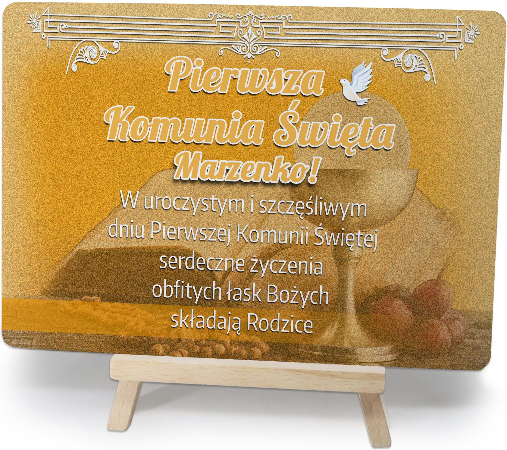 Personalizowana Pamiątka I Komunii Świętej na drewnianej sztaludze Dane techniczne: Rozmiar: 14x10 lub 20x14 cm + wysokość sztalugi Kształt: Prostokąt Grubość: 3mm, Materiał: metal, papier, drewno (sztaluga) Nadruk: pełnokolorowy, niewyczuwalny w dotyku Wyjątkowej urody pamiątka I Komunii Świętej jest naszym autorskim produktem. Pełnokolorowy personalizowany nadruk umieszczany na sztywnym metalowym elemencie idealnie komponuje się z drewnianą sztalugą, na której jest osadzany. Taki zestaw to idealny pomysł na prezent! Sprawdź koniecznie naszą ofertę, na pewno wybierzesz odpowiedni wzór i sprawisz niezapomniany oraz praktyczny prezent bliskiej Ci osobie. A może też znajdziesz coś dla siebie :)