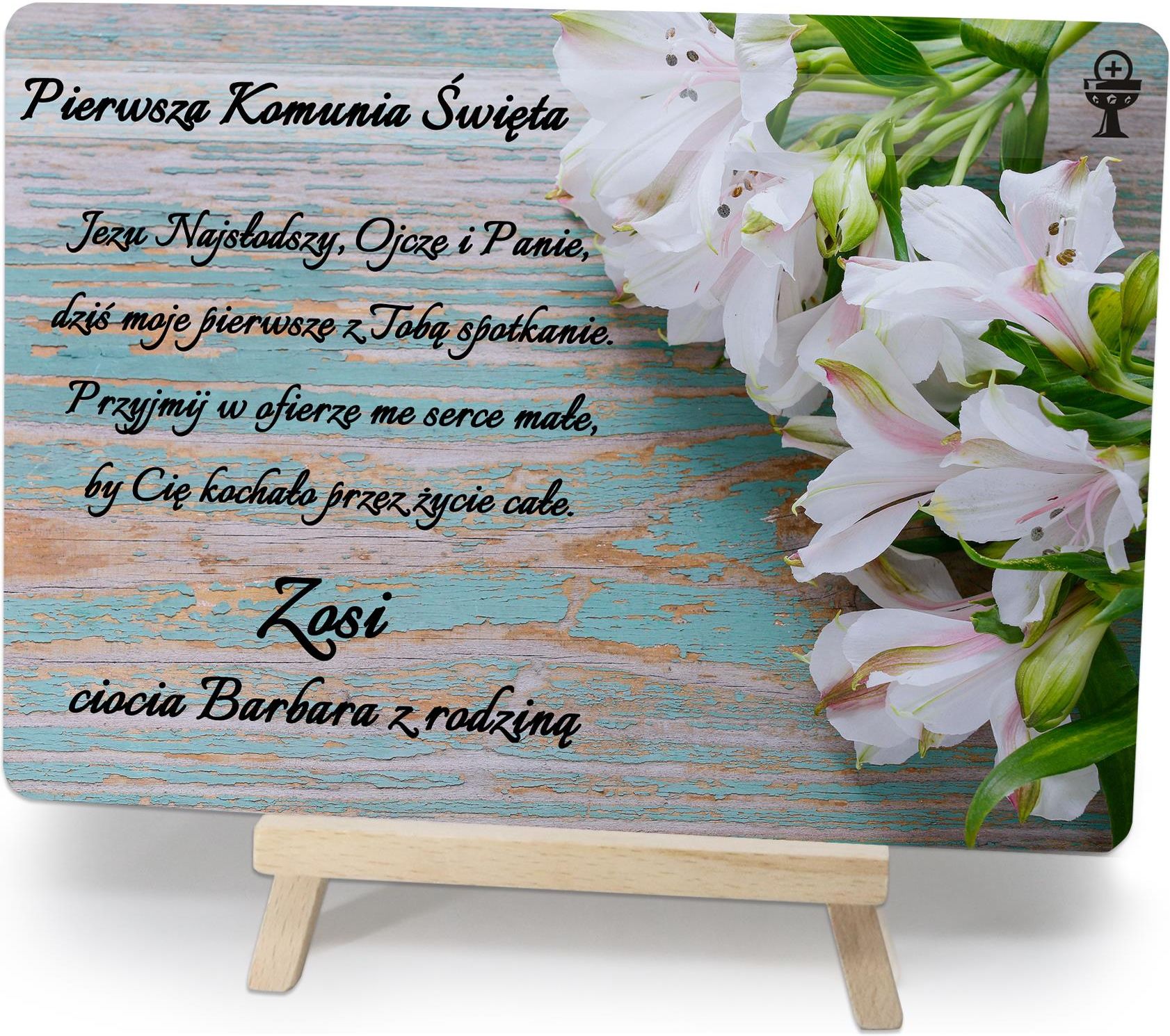 Personalizowana Pamiątka I Komunii Świętej na drewnianej sztaludze Dane techniczne: Rozmiar: 14x10 lub 20x14 cm + wysokość sztalugi Kształt: Prostokąt Grubość: 3mm, Materiał: metal, papier, drewno (sztaluga) Nadruk: pełnokolorowy, niewyczuwalny w dotyku Wyjątkowej urody pamiątka I Komunii Świętej jest naszym autorskim produktem. Pełnokolorowy personalizowany nadruk umieszczany na sztywnym metalowym elemencie idealnie komponuje się z drewnianą sztalugą, na której jest osadzany. Taki zestaw to idealny pomysł na prezent! Sprawdź koniecznie naszą ofertę, na pewno wybierzesz odpowiedni wzór i sprawisz niezapomniany oraz praktyczny prezent bliskiej Ci osobie. A może też znajdziesz coś dla siebie :)