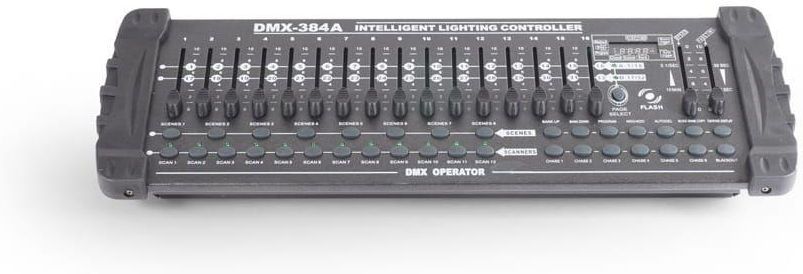Kontroler 384A DMX CONTROLLER 384ch 2019 to zaawansowane urządzenie do zarządzania oświetleniem, które obsługuje do 24 inteligentnych świateł, z możliwością przypisania 16 kanałów, co łącznie daje 384 kanały. Oferuje 30 banków chase, z możliwością zapisania 8 scen, oraz 6 chase, z maksymalnie 24 scenami w każdej. Umożliwia nagrywanie do 6 chase z regulowanym czasem przenikania i prędkością.Urządzenie wyposażone jest w 16 suwaków, co zapewnia precyzyjną kontrolę nad kanałami. Obsługuje kontrolę MIDI dla banków, chase oraz poziomów oświetlenia. Wbudowany mikrofon pozwala na pracę w trybie muzycznym, a program automatyczny jest sterowany suwakami.Kontroler posiada wejście/wyjście DMX 3-pin XLR oraz zasilanie 9V DC. Jest zasilany zewnętrznym zasilaczem.