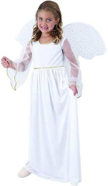 Strój Aniołek to biała ozdobna atłasowa szata z paskiem, ozdobiona srebną taśmą. Skrzydła z białym tiulem zakładane na gumkę. Zestaw zawiera sukienkę i skrzydła. długość całkowita: 101cm szerokość w pasie: 30-32cm od pachy do pachy: 32-33cm długość rękawa: 47cm szerokość w ramionach: 35cm skrzydła: 55x41cm