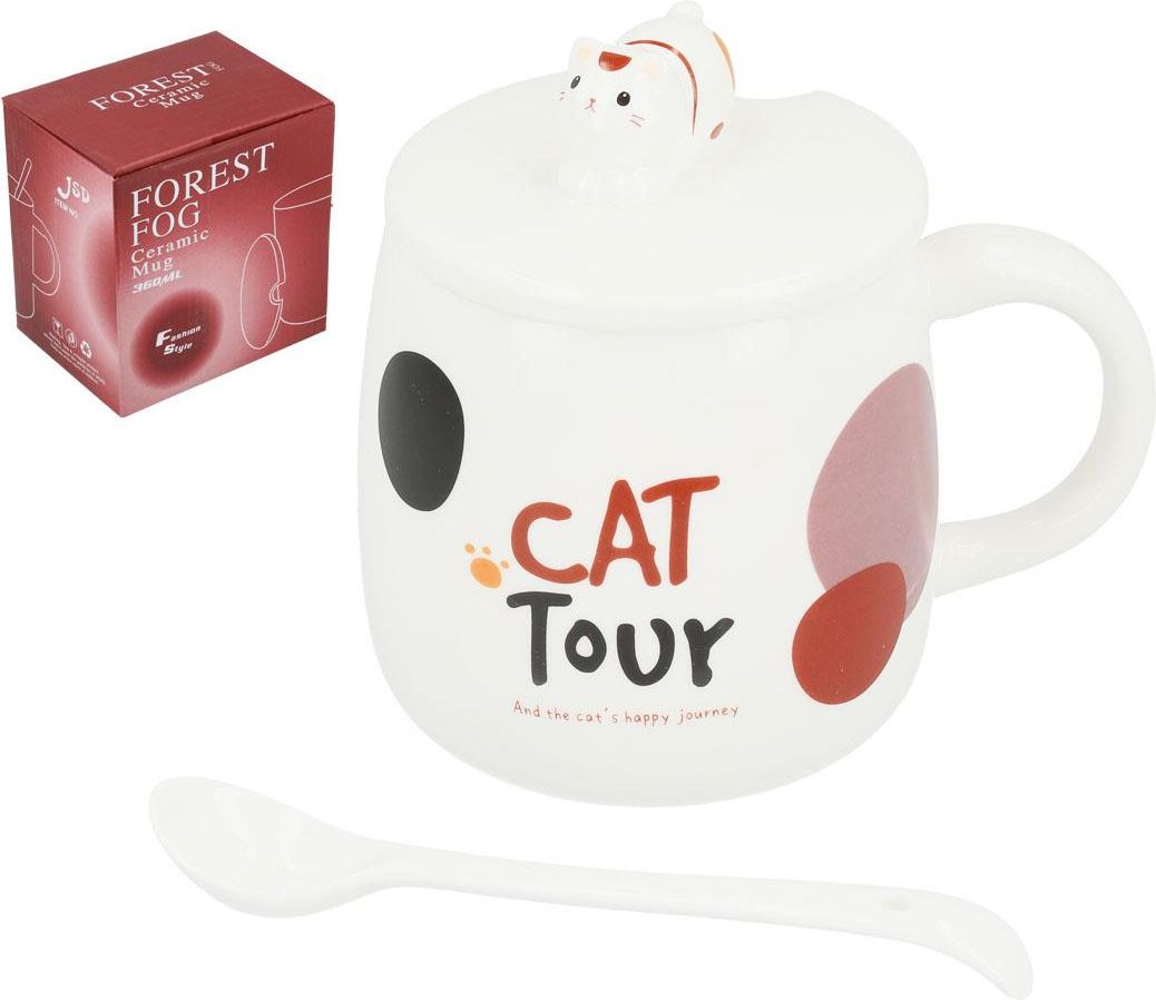 Porcelanowy kubek z pokrywką i łyżeczką. Pojemność kubka 410 ml (pojemność liczona po rant kubka). Ozdobiony motywem śladu kociej łapki oraz napisem "Cat tour" oraz "And the cat's happy journey". Kubek w kształcie beczułki, co stanowi wyjątkowe dopełnienie całego kubka. Porcelanowa pokrywka jest …