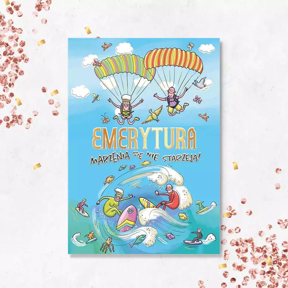 Karnet A5 Emerytura na fali wydrukowany na wysokiej jakości papierze formatu A5. Karnet uszlachetniony złotą folią i tłoczeniem. W zestawie koperta. EAN: 5908451981839