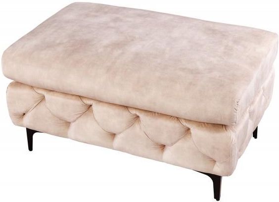 PUF MODERN BAROCK 92X62 CM BEŻOWY WELUR Puf Modern Barock wykonany jest w tkaninie welurowej w kolorze szampańskim. Mebel postawiony został na czarnych, metalowych nogach. Ozdobne pikowania po bokach pufy nadają wyjątkowy charakter całemu meblu. Odpoczynek na nim stanie się przyjemnością, a jego …