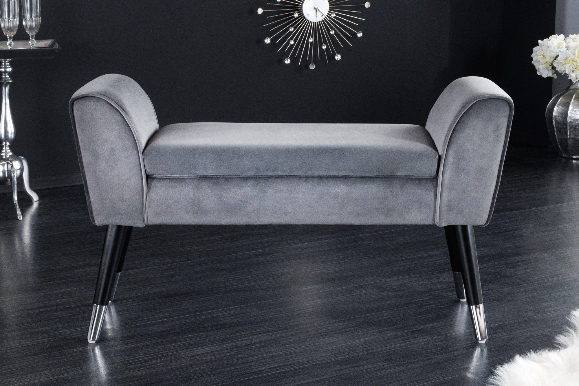 ŁAWKA SCARLETT 90 CM SZARA Nowoczesna ławka SCARLETT to funkcjonalne i praktyczne rozwiązanie idealnie pasujące zarówno do stylowej sypialni jak i salonu. Jej podłużne siedzisko obite zostało aksamitną tkaniną w kolorze szarym z pięknym wykończeniem. Ponadto oryginalne krzywizny, podłokietniki, wygodne siedzisko oraz drewniana czarna podstawa ozdobiona srebrnymi nakładkami nadaje całości wyjątkowy design. Prezentowany mebel wykonany jest z wysokiej jakości materiałów nadających wnętrzu niezwykle nowoczesny wygląd, zapewniając tym samym wygodne miejsce do siedzenia. Ważnym elementem jest wyprofilowane długie siedzisko, które wraz z podłokietnikami odpowiednio wspierają sylwetkę siedzącego podczas jej użytkowania. Sprawdzi się ona bez wątpienia zarówno w minimalistycznych klasycznych aranżacjach, jak i w tych elegancko zdobionych w stylu nowoczesnym. W serii SCARLETT występują także inne ławki w różnych kolorach - patrz produkty powiązane. Invicta Interior to niezawodny dostawca ekskluzywnych designerskich mebli i akcesoriów domowych. Jest to dynamiczna i doświadczona firma z wieloletnimi międzynarodowymi kontaktami i stale poszukującą nowych produktów i innowacyjnych pomysłów. Dojrzała ogólna koncepcja firmy pozwala zaoferować klientom duży wybór nowoczesnych i klasycznych mebli o wyjątkowej jakości w rozsądnych cenach. Invicta Interior monitoruje wszystkie aktualne trendy w branży meblowej, dlatego klienci zawsze otrzymują najnowsze i najwyższej jakości designerskie meble.