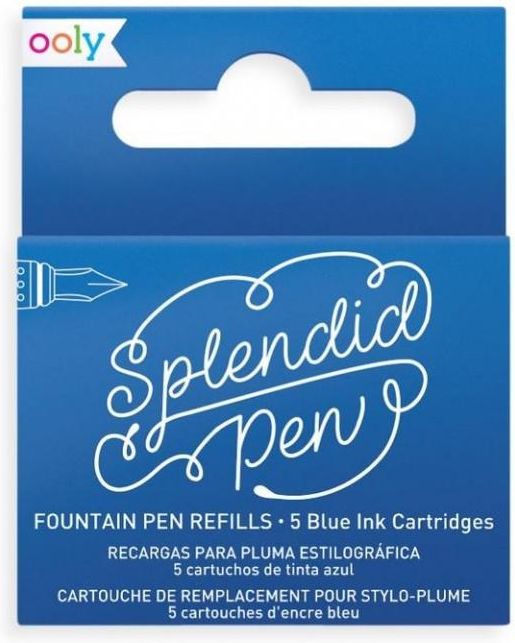 Zestaw wymiennych naboi do piór wiecznych Ooly. Dzięki nim nie musisz rezygnować z ulubionego sposobu pisania. W komplecie 5 sztuk w jednym kolorze. Naboje uzupełniające Ooly pasują do wszystkich piór wiecznych tej marki. naboje uzupełniające do piór wiecznych Ooly Splendid; 5 sztuk; niebieski atrament; dostępne także w innych kolorach: czarny, czerwony, zielony, fioletowy i różowy pasują do wszystkich piór wiecznych Ooly; wiek: 12+