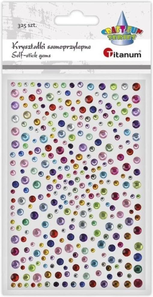 Dodatki Do RĘKODZIEŁA Ozdobne ELEMENTY Kryształki samoprzylepne Okrągłe Set Producent: Titanum Kryształki samoprzylepne okrągłe mix kolorów 3/4/5/6mm 325szt.