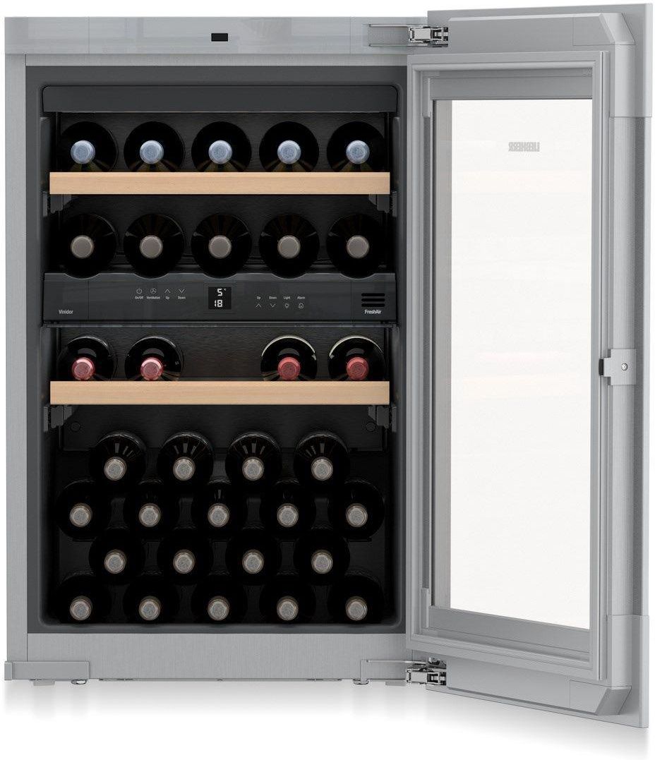 Chłodziarka do wina do zabudowy Liebherr EWTgb 1683 Vinidor Wysokość wnęki: 88 cm Wymiary: 90,6 / 59,5 / 57,2 cm Maksymalna liczba butelek typu Bordeaux o poj. 0,75 l: 33 Strefy temperatur: 2 Regulowane obiegi chłodnicze: 2 Klasa efektywności energetycznej: G Montaż drzwi: Równo z powierzchnią …
