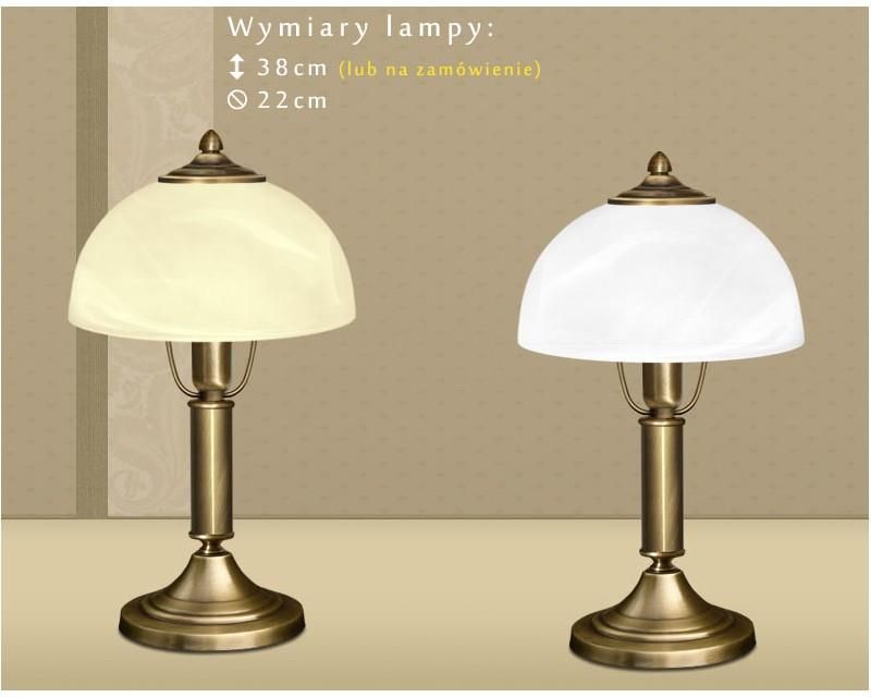 Lampa mosiężna biurkowa / stołowa. - Wykonana w całości z elementów z pełnego mosiądzu. Mosiądz to trwały, szlachetny i ponadczasowy materiał - kliknij, aby dowiedzieć się więcej. - Wykończenie mosiądzu: złota patyna. - Klosz szklany do wyboru: biały ‘alabaster’ lub ecru ‘alabaster’ (albo na zamówienie ecru gładki w zależności od dostępności). - Wymiary całkowite: wysokość 38cm, średnica klosza 22cm. - W podstawie lampy umieszczony jest odważnik zapewniający jej stabilność.- Włącznik na przewodzie zasilającym (przewód w kolorze lampy wyprowadzony jest z boku podstawy). - Żródło światła: 1xE14 (żarówka tradycyjna/żarowa o mocy max. 40W) lub żarówka energooszczędna albo LED o większej mocy (np. 80W). Lampa jest fabrycznie nowa, wyprodukowana w Polsce. Gwarancja: 24 miesiące. Seria D - zobacz wszystkie lampy