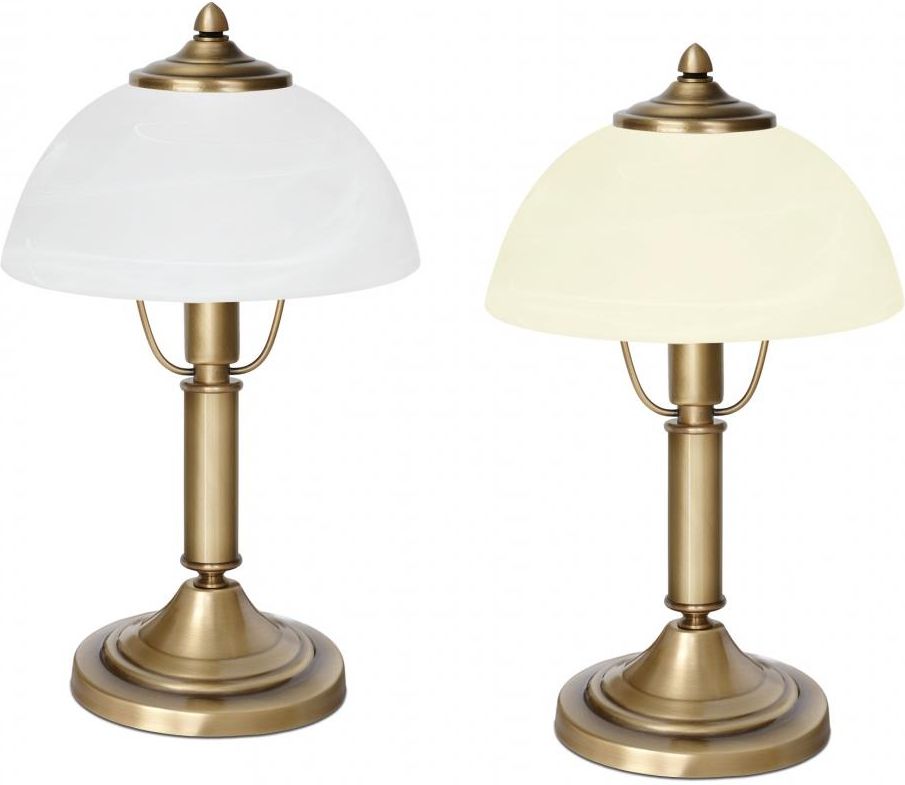 Lampa z mosiądzu biurkowa / stołowa. - Wykonana w całości z elementów z pełnego mosiądzu. Mosiądz to trwały, szlachetny i ponadczasowy materiał - kliknij, aby dowiedzieć się więcej. - Wykończenie mosiądzu: złota patyna. - Klosz szklany do wyboru: biały ‘alabaster’ lub ecru ‘alabaster’ (albo na zamówienie ecru gładki w zależności od dostępności). - Wymiary całkowite: wysokość 39cm, średnica klosza 22cm. - W podstawie lampy umieszczony jest odważnik zapewniający jej stabilność.- Włącznik na przewodzie zasilającym (przewód w kolorze lampy wyprowadzony jest z boku podstawy). - Żródło światła: 1xE14 (żarówka tradycyjna/żarowa o mocy max. 40W) lub żarówka energooszczędna albo LED o większej mocy (np. 80W). Lampa jest fabrycznie nowa, wyprodukowana w Polsce. Gwarancja: 24 miesiące. Seria VG - zobacz wszystkie lampy