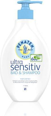 PENATEN ULTRA SENSITIV BAD & SHAMPOO - DELIKATNY PŁYN DO MYCIA WŁOSÓW I KĄPIELI - PERFUMFREI Pojemność: 400 ml (butelka) Waga brutto: 500 g Delikatny płyn do mycia ciała i kąpieli przeznaczony do codziennej pielęgnacji delikatnej skóry dziecka. Można stosować bezpośrednio na skórę dziecka, jako płyn do kąpieli i szampon. Zawarte w nim naturalne substancje natłuszczają delikatną skórę dziecka i zapewniają jej długotrwałą ochronę przed wysuszeniem a skóra staje się miękka i delikatna. Delikatny płyn do kąpieli i szampon dla dzieci firmy Penaten bez substancji zapachowych i perfum jest szczególnie dobrze tolerowany i został opracowany w celu zminimalizowania ryzyka alergii, do delikatnej i łagodnej pielęgnacji niemowląt. Skóra noworodków nie jest jeszcze w pełni rozwinięta i dlatego nie spełnia jeszcze wszystkich swoich ważnych funkcji ochronnych. Niemieckie Stowarzyszenie Alergii i Astmy (DAAB) swoim logo potwierdza, że ​​zalecane produkty są odpowiednie dla alergików. Składniki tego produktu zostały ocenione przez DAAB jako nieszkodliwe. Dodatkowo test u alergików i osób o wrażliwej skórze potwierdza dobrą tolerancję skóry. Dlatego polecany jest do podstawowej pielęgnacji bardzo wrażliwej skóry dziecka ze skłonnością do neurodermitów. Natychmiastowa ochrona skóry dziecka Idealny do kąpieli oraz mycia skóry i włosów Łagodny balsam myjący nie wysusza skóry Zgodność ze skórą przebadana dermatologicznie Można stosować od 1 dnia życia Pochodzenie : Niemcy Skład: Aqua, Cocamidopropyl Betaine, Glycerin, Sodium Laureth sulfate, Lauryl Glucoside, Coco-Glucoside, Sodium Chloride, Peg-7 Gyceryl Cocoate, Hydroxypropyl Guar Hydroxypropyltrimonium Chloride, Citic Acid, Sodium Benzoate