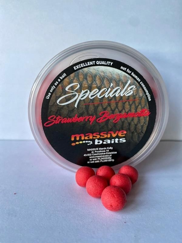 Przynęta Kulki Pływające Massive Baits Pop Up Strawberry Bergamotta 11 mm Producent: Massive Baits, Symbol: PU011 Kulki Massive Baits Special Pop-Ups Strawberry Bergamotta 11mm 150g SPECIAL POP-UPS to kulki pływające wykonane ręcznie. Charakteryzują się długą pływalnością oraz doskonałą strukturą. Dobrze przyjmują i jednocześnie intensywnie uwalniają aromaty. Wykonujemy je z wyjątkową starannością i dbałością o kształt, kolor i aromat. Dodajemy do naszego popup mixu dużą dawkę skoncentrowanych aromatów płynnych i proszkowych. Przynęty z serii SPECIAL bazują na mocnych i wyselekcjonowanych aromatach, przyprawach oraz ekstraktach. SPECIAL POP-UPS można śmiało przebijać i kroić na połówki przy całkowitym zachowaniu właściwości pływających. Rozmiar: 14mm (oraz 11mm) Opakowanie: 200ml Dostępne z serii: Bolsena Squid, Marisco, Fatal Attraction, Scarlett, Red Monstrum oraz Strawberry Bergamotta Kod produktu: PU011