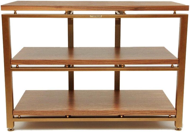 Stolik czteronożny, trójpoziomowy, z blatami gr. 30 mm pokrytymi naturalnym fornirem (orzech amerykański). Stelaż balastowany jest piaskiem kwarcowym (zakręcane otwory umieszczone z tyłu nóg umożliwiają zmianę ilości oraz rodzaju balastu). Kolor stelaża - złocisty mosiądz (połysk). Stoliki antywibracyjne przeznaczone są pod komponenty audio wysokiej klasy. Konstrukcje zostały zestrojone przez odpowiednie połączenie stali stopowych i wysokowęglowych. Rama składa się z grubościennych nóg wykonanych ze stali węglowej S235JR (stosowanej do konstrukcji nośnych poddawanych dużym obciążeniom dynamicznym - np. w dźwigach) oraz łączących je poprzeczek ze stali stopowej o podwyższonej wytrzymałości S355. Precyzyjnie poziomowane odbywa się za pomocą regulowanych stożków antywibracyjnych. OPIS TECHNICZNY • wysokość całkowita - 770 mm; • szerokość całkowita - 1090 mm; • głębokość całkowita - 490 mm; • przekrój nóg - profil zamknięty 40 x 40 mm • blat wierzchni - 1090 x 490 x 30 mm; • blaty wewnętrzne - 1005 x 450 x 30 mm; • światła pomiędzy półkami (licząc od dołu) - 250, 250 mm; • obciążenie każdej półki - do 100 kg (razem 300 kg) W ZESTAWIE: • 1 stelaż stalowy; • 3 blaty (MDF/fornir); • 22 stożki do regulowania poziomu; • 18 talerzyków separujących; • 4 podkładki chroniące podłogę