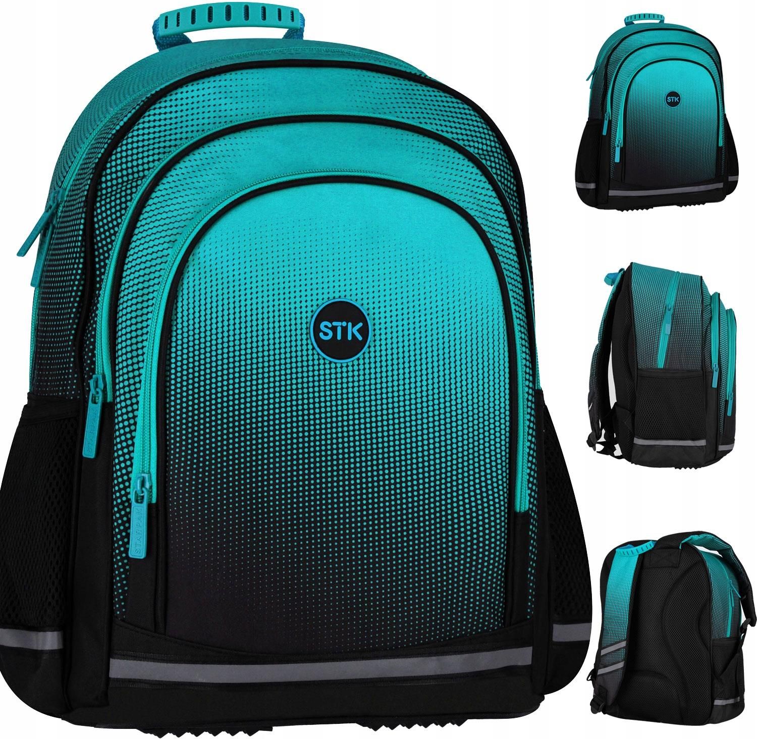 Starpak Plecak Szkolny Gradient Ocean 553167 plecak składa się z 1 dużej komory i 2 obszernych przedniej kieszeni 2 boczne wzmocnione kieszenie siatkowe na butelkę z napojem wytrzymałe zamki błyskawiczne, plecak wykonany z mocnego materiału poliestrowego 600D specjalnie powlekanego wodoodporną warstwą plastikowe stópki na spodzie plecaka ochrona przed wilgocią i brudem ergonomiczne plecy i szelki plecy z systemem wentylacji dla większego komfortu grube, miękkie szelki chronią ramiona- regulowane szelki pozwalają dopasować plecak do wzrostu i budowy ciała uchwyt wzmocniony gumową opaską powalające zawiesić plecak na wieszaku lub wygodnie nosić go w ręce odblaskowe paski umieszczone na przedniej kieszeni, na obu bocznych kieszeniach i na szelkach zwiększające widoczność plecaka w nocy bezpieczeństwo dziecka Wymiary: 41x30x20 Waga plecaka: 0,61 kg. Plecak szkolny STARPAK jest wykonany z mocnego materiału poliestrowego 600D specjalnie powlekanego wodoodporną warstwą. Mocne szwy i przeszycia, wytrzymałe zamki błyskawiczne gwarantują, że plecak przetrwa w każdych warunkach jakie może mu stworzyć młody człowieka. Plecak składa się z dużej bardzo pojemnej komory i 2 przednich kieszeni. Główna komora plecaka STARPAK została wyłożona specjalną wzmocniona i łatwą w czyszczeniu podszewką. Komora jest bardzo pojemna. Zmieści się w niej wszystko co potrzebne w szkole. Dodatkowo 2 przednie kieszenie ułatwią utrzymanie porządku i poprawią organizację. Z obu stron plecaka umieściliśmy siatkowe kieszenie na butelki z napojem. Kieszenie zostały specjalnie wzmocnione wytrzymałem materiałem. Najważniejszą dla zdrowia dziecka częścią plecaka są szelki i plecy. Dzięki ergonomicznym rozwiązaniom plecaki STARPAK gwarantują bezpieczeństwo i komfort użytkowania. Plecy zostały wyposażone w systemem wentylacji. Specjalnie zaprojektowany kształt kanału powietrznego zwiększa komfort i higienę użytkowania nawet kiedy robi się gorąco. Szelki są grube i miękkie. Dzięki czemu nawet ciężki plecak STARPAK nosi się wygodnie. Dla zwiększenia komfortu i lepszego odprowadzania wilgoci plecy zostały pokryte meshową tkaniną. Szelki można oczywiście regulować. Pozwala to dopasować plecak do wzrostu i budowy ciała dziecka. Żeby zwiększyć bezpieczeństwo w nocy na szelkach umieszone są odblaskowe paski. Paski umieściliśmy na przedniej kieszeni, na obu bokach plecaka i na szelkach. Dzięki temu dziecko będzie lepiej widoczne dla kierowców i rowerzystów wieczorem lub po zmroku.