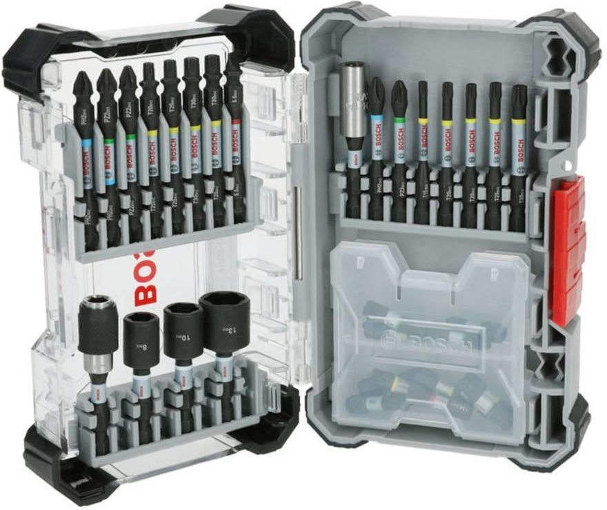 Zestaw bitów do wkrętarek PRO Impact Set Do 50 razy bardziej wytrzymały niż bit Bosch 2607001528 Extra Hard Niezawodne wkręcanie PRO Impact Set do niezawodnego wkręcania Jeśli szukasz kompaktowego i niezawodnego zestawu bitów do wkrętarek, którego można używać w trudnych pracach, to mamy produkt dla Ciebie. Wypróbuj nasz zestaw bitów PRO Impact Set. Zawiera bity do większości prac związanych z wkręcaniem. Zestaw wytrzymałych bitów do wkrętarek PRO Impact to doskonały wybór dla instalatorów. Są wykonane z modyfikowanej stali poddanej obróbce cieplnej, co zapewnia im wyjątkową wytrzymałość i odporność na wysoki moment obrotowy. Strefa skręcania pochłania naprężenia momentu obrotowego na końcówce, zapobiegając ich łamaniu. Kolorowe pierścienie wskazują typ główki, a oznaczenia laserowe pomagają wybrać odpowiedni rozmiar. Elementy są umieszczone w solidnym opakowaniu i rozmieszczone w uchwytach, z których można stworzyć własną skrzynkę narzędziową.