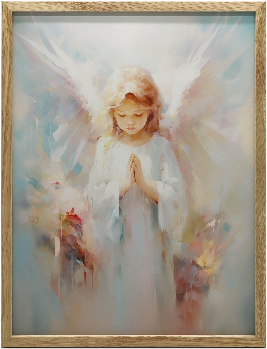 Ten urokliwy plakat przedstawia małego aniołka w modlitwie, wykonany w delikatnych pastelowych kolorach techniką olejną. Jego spokojna i duchowa aura sprawia, że jest idealnym dodatkiem do pokoju dziecięcego, wprowadzającym atmosferę spokoju i harmonii. To doskonały prezent na urodziny, komunię czy chrzest, który doda przestrzeni duchowego uroku. Udekoruj pokój swojego malucha tą piękną sztuką i stwórz miejsce pełne miłości oraz spokoju.