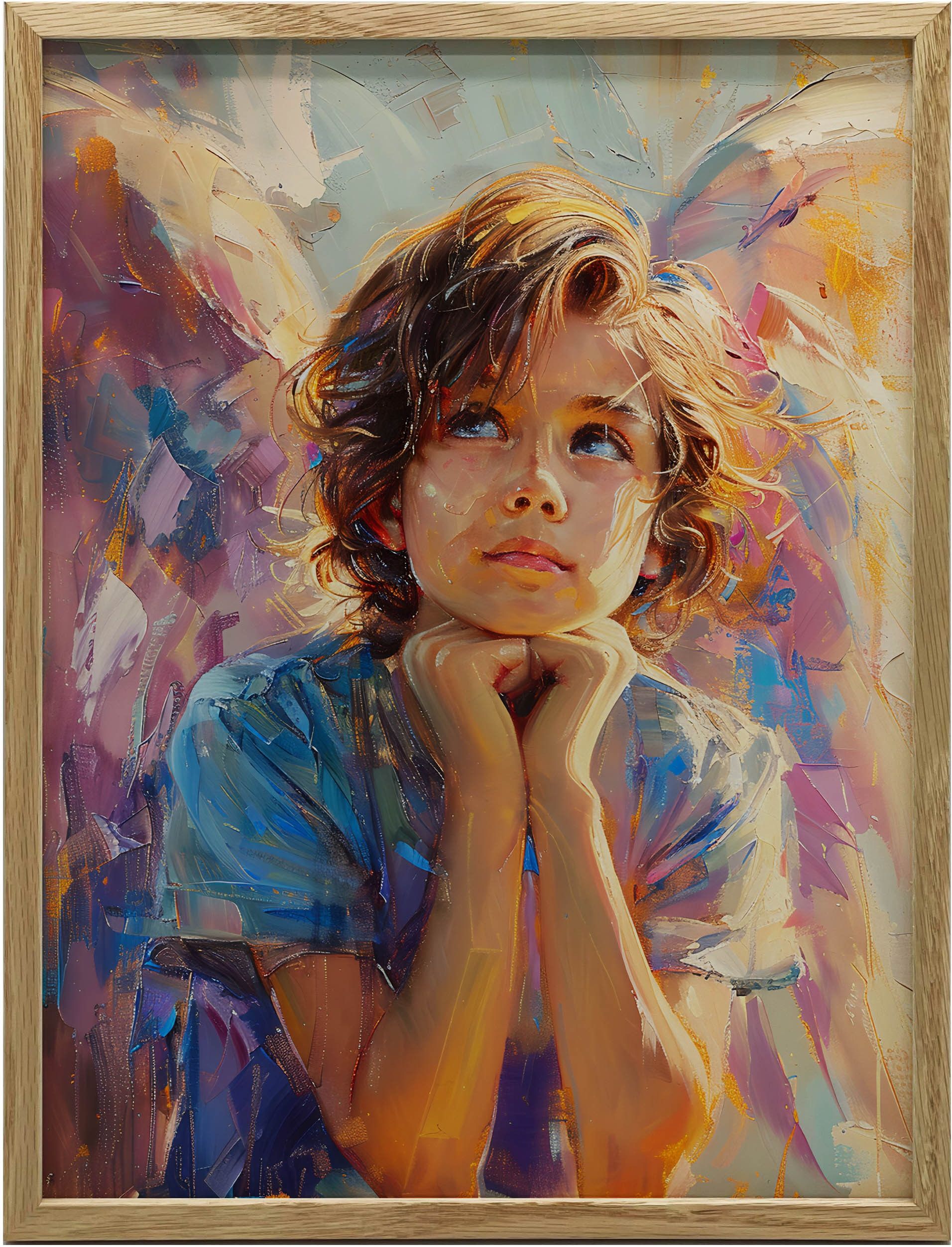 Plakat "Anielska Zaduma" przedstawia małego chłopca o anielskich skrzydłach, z zamyślonym wyrazem twarzy, który wyraża niewinność i marzycielski nastrój. Jasne barwy i delikatne oświetlenie nadają mu eteryczny wygląd, czyniąc go piękną dekoracją oraz źródłem inspiracji do refleksji. Doskonale nadaje się do pokoju dziecka, wprowadzając atmosferę radości i spokoju. "Anielska Zaduma" to wspaniały prezent na różne okazje, takie jak urodziny czy Chrzest Święty, który z pewnością zachwyci zarówno dzieci, jak i dorosłych, przypominając o marzeniach i pięknie dzieciństwa. Plakat może być dostępny w ramie lub bez niej, co umożliwia dopasowanie go do każdego wnętrza.