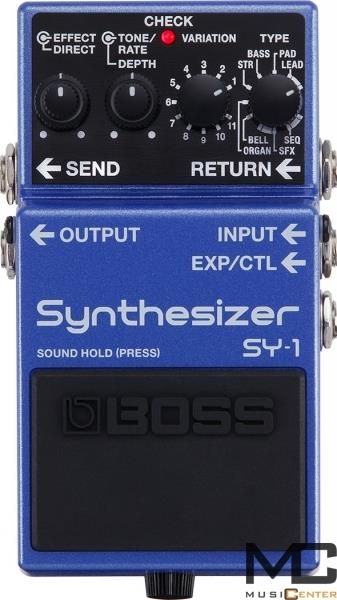 Journey to New Sonic Frontiers With the SY-1, it’s never been easier to infuse your creative arsenal with BOSS’s legendary guitar synth technology. This amazingly expressive tool is filled with 121 ultra-responsive sounds, all distilled down into a BOSS compact pedal that slides easily into any setup. Best of all, it’s as simple to use as a standard stompbox, so you don’t need any background in synth programming to bring a new world of sonic textures to your music. Standard Features Authentic BOSS polyphonic guitar synth in a compact pedal No special pickup required—play rich, dynamic synth tones with any guitar or bass 121 total sounds (11 types and 11 variations), all ready to play with no programming knowledge needed Includes a wide variety of analog-style synth sounds, from leads, basses, and layered organs to sweeping pads and arpeggiated sequences Latency-free performance for unrestricted musical expression Quickly adjust sounds to taste with Tone/Rate and Depth controls Hold function for playing normal guitar over sustained synth voices Blend synth and normal guitar sounds with independent level controls Parallel send/return loop for easy integration with other pedals on your board Mode switch optimizes the synth engine for guitar or bass Supports extended control with an external footswitch or expression pedal SY-1 SYNTHESIZER Sound TryoutGet interactive with our custom TonePedia player and explore hundreds of sound variations. Select your instrument, tweak and choose pedal settings. Expressive Synth Sounds, No Programming NeededThe SY-1 transforms any guitar or bass into a versatile synthesizer that’s fun, inspiring, and ready to play. Backed by advanced tech first developed for the SY-300, this super-cool pedal delivers a huge selection of analog-style synth sounds while occupying minimal space on your board. What’s more, all the sounds are polyphonic, allowing you to play both single notes and chords. Plug-and-Play and Latency-FreeThe SY-1 can be used with any guitar or bass via a standard 1/4-inch cable, providing an easy, plug-and-play experience. Thanks to custom DSP and the latest BOSS innovations, the SY-1 offers latency-free performance that’s a natural extension of your instrument, letting you to play freely and organically without altering your normal technique in any way. A Universe of Synth Sounds InsideWith its 11 categories and 121 total sounds, the SY-1 puts an enormous array of synth colors at your fingertips. Expressive leads, sweeping pads, layered organs, fat basses, and more are all on tap, plus a variety of rhythmic synth patterns that are a blast to jam with. And with the grab-and-go Tone/Rate and Depth knobs, you’re able to adjust any synth voice just how you like, including changing the pitch on some sounds. At Home in Any Rig As a standard BOSS compact, the SY-1 drops into a serial pedal chain like any other stomp. But with the send/return loop and dedicated mix controls, it’s also possible to blend one or more pedals in parallel with the SY-1’s synth voices. For example, you can patch drive pedals in the loop, and then send the combined output to mod, delay, and reverb pedals for overall processing. The send can be used as a direct out as well, enabling you to route synth and guitar sounds to separate destinations. Enhance Performances with Real-Time ControlThe SY-1 offers a numbers of ways to make your synth performances even more dynamic and expressive. Pressing and holding the pedal switch sustains the last-played synth sound, allowing you to jam with regular guitar over the top. You can also connect an external footswitch for tap tempo and octave-shift effects, or plug in an expression pedal for continuous Tone/Rate control. Nominal Input Level INPUT, RETURN: -20 dBu Input ImpedanceINPUT, RETURN: 2.2 M ohms Nominal Output LevelOUTPUT, SEND: -20 dBu Output ImpedanceOUTPUT, SEND: 1 k ohms Recommended Load Impedance10 k ohms or greater BypassBuffered bypass Controls Pedal switch GUITAR/BASS switch TYPE knob VARIATION knob TONE knob DEPTH knob EFFECT knob DIRECT knob IndicatorCHECK indicator (Serves also as battery check indicator) ConnectorsINPUT jack: 1/4-inch phone type OUTPUT jack: 1/4-inch phone type SEND jack: 1/4-inch phone type RETURN jack: 1/4-inch phone type EXP/CTL jack: Stereo 1/4-inch phone type DC IN jack Power SupplyAlkaline battery (9 V, 6LR61) AC adaptor (PSA series: sold separately) Current Draw85 mA Expected battery life under continuous useAlkaline: Approx. 3 hours *These figures will vary depending on the actual conditions of use. AccessoriesOwner's manual Leaflet ("USING THE UNIT SAFELY," "IMPORTANT NOTES," and "Information") Alkaline battery (9 V, 6LR61) Options (sold separately) AC adaptor: PSA series Footswitch: FS-5U Dual footswitch: FS-6, FS-7 Expression pedal: FV-500H, FV-500L, EV-30, Roland EV-5