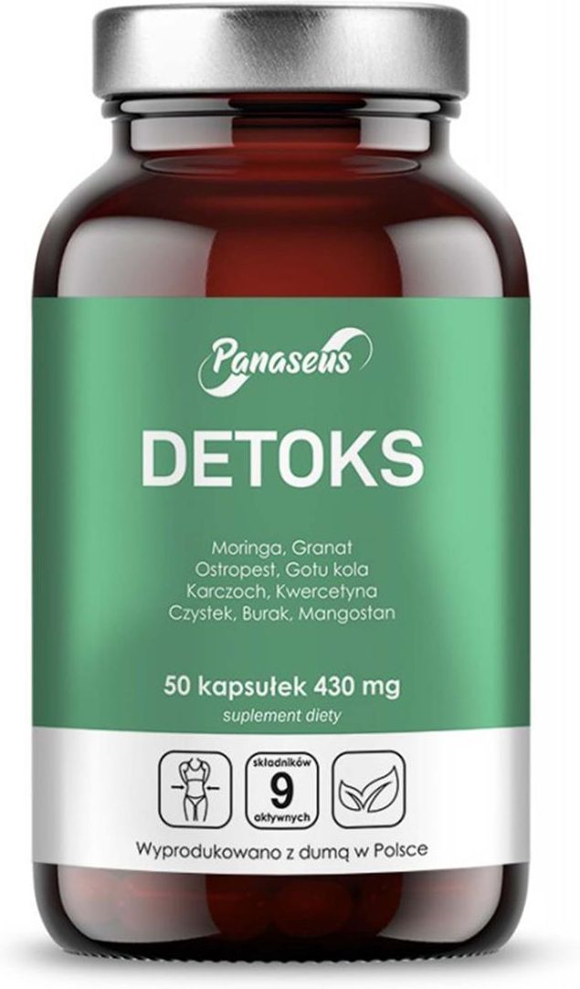 Detoks - Panaseus - 50 kaps Suplement diety Detoks od Panaseus to doskonałe wsparcie w procesie detoksykacji organizmu, które ma kluczowe znaczenie dla zdrowego i efektywnego odchudzania. Dzięki unikalnej formule, łączącej naturalne składniki roślinne, produkt ten wspomaga oczyszczanie organizmu oraz pracę wątroby. To idealna propozycja dla osób pragnących zadbać o swoje zdrowie i zrzucić zbędne kilogramy. Pojemność i forma Suplement diety detoksykacyjny występuje w formie kapsułek, co sprawia, że jest łatwy i wygodny w użyciu. Opakowanie zawiera 50 kapsułek, co zapewnia 50 dni naturalnej suplementacji. Aby skorzystać z dobroczynnych właściwości, wystarczy przyjąć jedną kapsułkę dziennie, popijając ją dużą ilością wody, najlepiej po posiłku. Taka forma podawania ułatwia wprowadzenie preparatu do codziennej diety. Skład W skład suplementu wchodzą starannie dobrane ekstrakty roślinne, które działają synergicznie w celu oczyszczenia organizmu. Oto lista składników aktywnych zawartych w jednej kapsułce: gotu kola (ekstrakt) - 50 mg (w tym saponiny triterpenowe 10% - 5 mg), czystek (ekstrakt 10:1) - 45 mg, burak (ekstrakt 10:1) - 45 mg, moringa (sproszkowane liście) - 35 mg, karczoch (ekstrakt 10:1) - 35 mg, mangostan (ekstrakt 10:1) - 25 mg, ostropest plamisty (ekstrakt) - 25 mg (w tym sylimaryna 80% - 20 mg), perełkowiec japoński (ekstrakt) - 25 mg (w tym kwercetyna 98% - 24,5 mg), granat (ekstrakt) - 20 mg (w tym kwas elagowy 40% - 8 mg). Taki dobór składników sprawia, że produkt ma szerokie spektrum działania, a użytkownicy mogą mieć pewność, że sięgają po wysokiej jakości suplement diety. Działanie suplementu Suplement detoksykacyjny ma na celu wspomaganie naturalnych procesów oczyszczania organizmu. Dzięki zastosowaniu silnych ekstraktów roślinnych, działa na kilka frontów: Wspomaganie detoksykacji - Ekstrakt z buraka pomaga w usuwaniu toksyn z organizmu, co jest kluczowe dla zdrowia i samopoczucia. Wsparcie dla wątroby - Ostropest plamisty jest znany z właściwości ochronnych dla wątroby, co przynosi korzyści w procesie oczyszczania. Regulacja masy ciała - Ekstrakt z karczocha wspiera utrzymanie prawidłowej masy ciała, co może być korzystne dla osób dążących do zrzucenia zbędnych kilogramów. Zwiększenie energii - Moringa i mangostan dostarczają składników odżywczych, które mogą zwiększać poziom energii i poprawiać ogólne samopoczucie. Wskazania do stosowania Suplement diety detoksykacyjny jest doskonałym wyborem dla osób, które: chcą oczyścić organizm z toksyn, szukają wsparcia w utrzymaniu prawidłowej masy ciała, pragną poprawić funkcjonowanie wątroby, potrzebują wsparcia w regularnym procesie detoksykacji. Produkt może być szczególnie pomocny w okresach, kiedy organizm narażony jest na zwiększone obciążenie toksynami, np. po intensywnych świątecznych ucztach czy po okresie letnim, kiedy dieta często obfituje w mniej zdrowe opcje. Dawkowanie Zalecana dawka to jedna kapsułka dziennie, najlepiej przyjmowana po posiłku, popijana dużą ilością wody. Regularne stosowanie przez 50 dni pomoże w osiągnięciu zamierzonych efektów detoksykacji. Przeciwwskazania i bezpieczeństwo Podczas stosowania suplementu diety detoksykacyjnego należy pamiętać o kilku ważnych przeciwwskazaniach: nie należy stosować suplementu w przypadku ciąży, karmienia piersią, ani u dzieci, osoby przyjmujące leki powinny skonsultować się z lekarzem lub farmaceutą przed rozpoczęciem suplementacji. Zaleca się przechowywanie produktu w suchym i ciemnym miejscu, w temperaturze pokojowej oraz w sposób niedostępny dla małych dzieci. Produkt nie może być stosowany jako substytut zróżnicowanej diety. Informacje/cechy dodatkowe Suplement diety detoksykacyjny jest wegański, co czyni go odpowiednim wyborem dla osób dbających o swoje zdrowie i preferujących produkty roślinne. Ponadto, produkt nie zawiera sztucznych dodatków, co podkreśla jego naturalny charakter. Wyprodukowano w Polsce, co zapewnia kontrolę jakości na każdym etapie produkcji. Stosując suplement detoksykacyjny, można mieć pewność, że wspiera się swoją drogę do zdrowego stylu życia, jednocześnie korzystając z dobrodziejstw natury.
