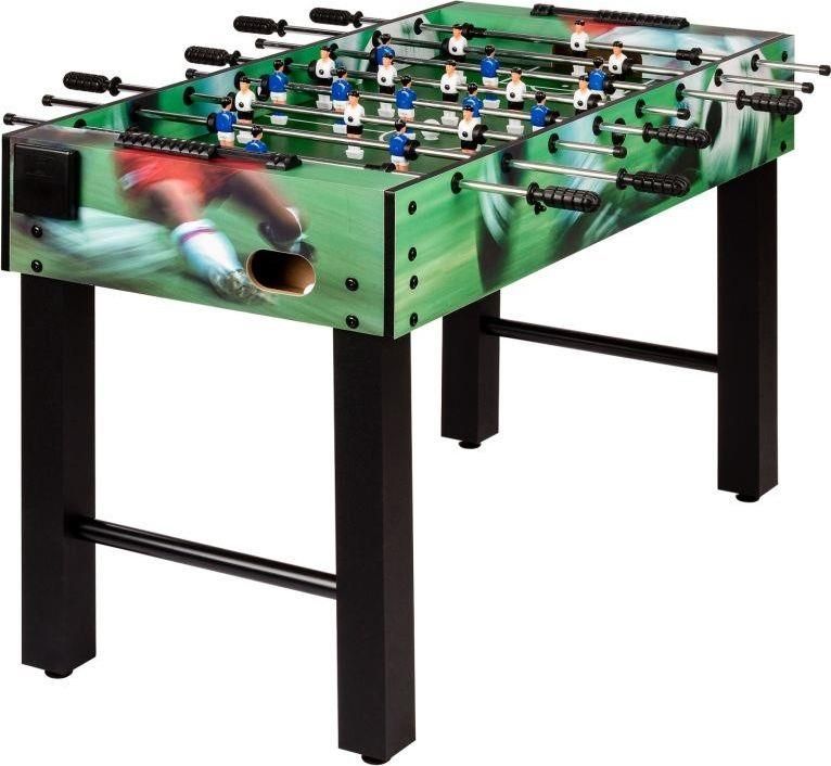Piłkarzyki są przeznaczone przede wszystkim dla początkujących, ale nawet bardziej zaawansowani mogą się dobrze bawić. Antypoślizgowe, ergonomicznie zaprojektowane uchwyty i łożyska ślizgowe zapewniają łatwą grę. Dzięki gładko podniesionym narożnikom boiska piłka nigdy nie pozostaje w rogu. Aby zapewnić wysoką stabilność, piłka nożna ma dwa stabilizatory pod boiskiem i rozpórki poprzeczne, które można regulować na wysokość, aby wypoziomować stół. . Piłka wyposażona jest w 2 specjalne piłki o chropowatej powierzchni zapewniającej optymalną przyczepność i dobre właściwości prowadzenia piłki. Dane techniczne: wymiary: 121 x 101 x 79 cm (szerokość wraz z kijem do gier) szerokość bez paska: ok. 61 cm wymiary boiska: 105 x 58 cm grubość ścianki 15 mm chromowane i polerowane pręty stalowe średnica pręta: 13 mm waga ok. 21 kg przykręcone i pomalowane postacie gracza - Niemcy (biało-czarny), Włochy (niebiesko-biały) wymiary opakowania: 124,5 cm x 60,5 cm x 12 cm 2 x licznik bramek 2 x uchwyt na kubek Zawartość opakowania: 1x piłka nożna (dostarczana w zdemontowana) 2x kulki (31 mm) 1x instrukcja montażu