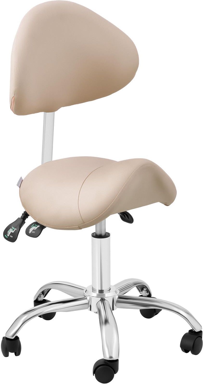 Krzesło siodłowe - oparcie i siedzisko z regulacją wysokości - 55-69 cm - 150 kg - kremowe, srebrne marki Physa Model: PHYSA MANNHEIM CREAM Nr katalogowy: 10040494 Stan produktu: Nowy Najważniejsze cechy produktu Solidność – siedzisko można obciążyć do 150 kg Elastyczność – oparcie można pochylić o 0-22° Mobilność – siedzisko obracane o 360°, 5 kółek Przyjazne dla użytkownika – szybka i łatwa regulacja wysokości siedziska i oparcia Wygoda – komfortowe siedzisko poryte pianką Specyfikacja techniczna Instrukcja obsługi - Tak Okrągły podnóżek - Nie Maksymalna wysokość siedzenia - 69 cm Maksymalne obciążenie - 150 kg Minimalna wysokość siedzenia - 55 cm Grubość obicia - 40 mm Zakres obracania krzesła 360° - Tak Liczba rolek - 5 Pc Regulowany kąt siedzenia - Tak Materiał - Stal chromowana Kolor - Kremowy, Srebrny Mechanizm podnoszący - Sprężyna gazowa Materiał obicia - Gąbka, Sztuczna skóra (PVC) Wymiary podstawy [cm] - Ø 53 Wymiary siedziska [mm] - 440 x 350 Zakres regulacji kąta pochylenia oparcia [°] - 90 - 120 Wysokość paczki [cm] - 27 Długość paczki [cm] - 62 Szerokość paczki [cm] - 60 Waga paczki [kg] - 10.2 Wysokość produktu [cm] - 104 Długość produktu [cm] - 59 Szerokość produktu [cm] - 59 Waga produktu [kg] - 8.4 Liczba paczek - 1 Dodaje ożywienia ciału – krzesło siodłowe na 5 kółkach Wygodne krzesło siodłowe z oparciem, którego siedzisko ma kształt siodła, jak wskazuje nazwa, to produkt marki Physa. Wyposażone w obrotowe, gładkie koła jezdne i różne możliwości regulacji pasuje do każdego salonu kosmetycznego lub fryzjerskiego. Sprawdzi się szczególnie tam, gdzie wymaga się jednocześnie ustawienia wysokości i nachylenia, wygody i stabilności. Zapewnia znaczną mobilność nawet w ciasnych przestrzeniach. Wysokiej jakościhoker kosmetyczny znosi obciążenie do 150 kg. Sprawia to, że siodło kosmetyczne jest tak wartościowe: może być używane na wiele sposobów, np. w studiach tatuażu, ośrodkach SPA & Wellness oraz w domach lub biurach. Pracuj ze zdrową postawą na taborecie siodłowym PHYSA MANNHEIM CREAM Każdy, kto szuka maksymalnego komfortu, który nie obciąża pleców, powinien kupić ten model. Posiada on oparcie, które można pochylić o 0-22° za pomocą dźwigni. Dzięki drugiej łatwej w obsłudze dźwigni oparcie ustawisz na wysokość 89-103 cm. Poduszka siedziska wypełniona pianką o grubości 5 cm pokryta jest skórą PVC i zapewnia dodatkowy komfort. Krzesło siodłowe wyposażono w podstawę z solidnymi 5 kółkami, które obracają się o 360°. Dzięki temu pchanie lub ciągnięcie krzesła jest znacznie łatwiejsze, zarówno w pomieszczeniach komercyjnych, jak i mieszkalnych. Jednocześnie podstawa zapewnia stabilność. Siedzisko także obraca się o 360°. Jest to szczególnie przydatne przy wszystkich pracach wymagających mobilności. Siedzisko łatwo i szybko uregulujesz na wysokość 55-69 cm. Aby to zrobić, wystarczy nacisnąć dźwignię pod siedziskiem w odpowiednim kierunku. Siedzisko przesuwa się płynnie w górę/dół dzięki sprężynie gazowej. Solidny hoker kosmetyczny z oparciem wytrzymuje maksymalne obciążenie 150 kg. Tapicerka ze skóry PVC jest bardzo łatwa w pielęgnacji. Nie wchłania płynów i kurzu. Wysokiej jakości materiały zapewniają solidną konstrukcję. Połączenie chromowanej stali i eleganckiego obicia gwarantuje również stylowy oraz atrakcyjny wygląd. Zawartość przesyłki Krzesło siodłowe PHYSA MANNHEIM CREAM Instrukcja obsługi Zdjęcia produktu