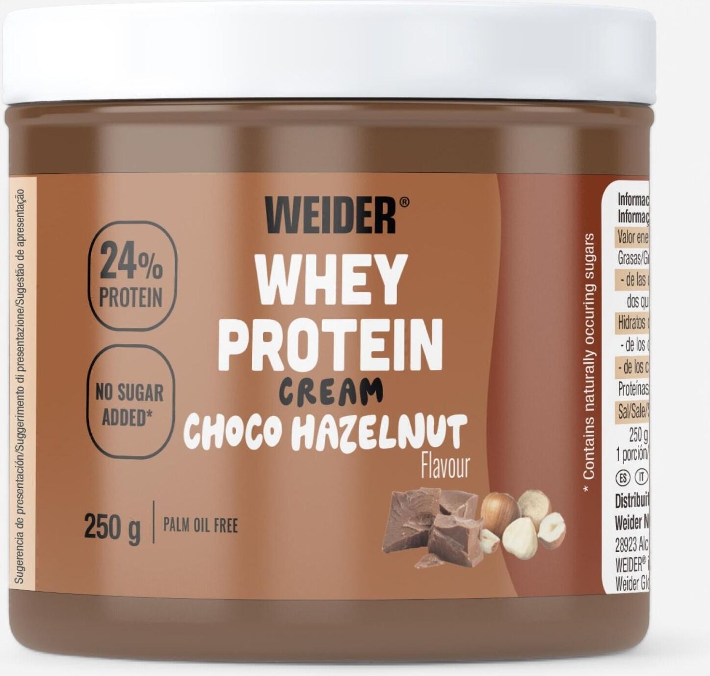 WEIDER WHEY PROTEIN 250G KREM PROTEINOWY 24% BIAŁKA CZEKOLADA ORZECH Weider Whey Protein Cream – smaczny krem proteinowy z białkiem serwatkowym SMAK CZEKOLADA ORZECHOWA. Zdrowsza alternatywa dla klasycznych kremów – pyszny smak, wysoka zawartość białka, zero oleju palmowego Weider Whey Protein Cream to wyjątkowe smarowidło białkowe, które powstało z myślą o osobach aktywnych fizycznie oraz wszystkich, którzy cenią sobie zdrowy styl życia, ale nie chcą rezygnować z przyjemności słodkiego smaku. Krem zawiera aż do 24% białka serwatkowego, dzięki czemu wspiera wzrost i utrzymanie masy mięśniowej, a jednocześnie jest pyszną przekąską o obniżonej zawartości cukru i tłuszczu. Nowa, ulepszona receptura zapewnia doskonały smak, aksamitną konsystencję i skład bez oleju palmowego. Produkt został stworzony na bazie naturalnych orzechów, które nadają mu wyjątkowego aromatu oraz dostarczają zdrowych tłuszczów. To idealny wybór dla osób dbających o linię, sportowców, a także dla wszystkich, którzy szukają lepszej alternatywy dla tradycyjnych kremów do smarowania. Korzyści ze stosowania Weider Whey Protein Cream Krem białkowy od Weidera to coś więcej niż zwykły słodki dodatek: zawiera aż 24% białka serwatkowego, które wspiera regenerację mięśni i budowę masy, wzbogacony jest o naturalne orzechy (laskowe, pistacje, migdały), które dostarczają zdrowych tłuszczów i wyjątkowego smaku, nie zawiera oleju palmowego, dzięki czemu jest bardziej przyjazny dla zdrowia i środowiska, jest bez dodatku cukru, słodzony maltitolem – idealny dla osób redukujących masę ciała lub unikających nadmiaru cukrów prostych, ma kremową konsystencję, dzięki której doskonale sprawdza się jako dodatek do pieczywa, naleśników, deserów, owsianek czy nawet prosto ze słoika, jest bezglutenowy, więc odpowiedni także dla osób z nietolerancją glutenu, w porównaniu do klasycznych kremów do smarowania zawiera mniej cukru i tłuszczu, a więcej wartościowych składników. Zastosowanie Weider Whey Protein Cream świetnie sprawdzi się jako: dodatek do zdrowych śniadań, np. owsianki, tostów, naleśników, urozmaicenie deserów i wypieków fitness, szybka i smaczna przekąska w ciągu dnia, alternatywa dla tradycyjnych, kalorycznych kremów czekoladowych. Spożywaj według potrzeb – bez wyrzutów sumienia! Podsumowanie Weider Whey Protein Cream to doskonałe połączenie smaku i wartości odżywczych. Dzięki wysokiej zawartości białka serwatkowego, naturalnym orzechom i braku oleju palmowego, krem stanowi zdrowszą alternatywę dla klasycznych past do smarowania. To idealny wybór dla sportowców, osób aktywnych i wszystkich, którzy chcą cieszyć się słodką przyjemnością w zdrowszej formie. 👉 Postaw na smak i jakość od renomowanej marki Weider i wprowadź do swojej diety krem, który łączy przyjemne z pożytecznym! Wartości odżywcze w 100 g produktu Wartość energetyczna: 2390 kJ / 577 kcal Tłuszcz: 45 g w tym kwasy tłuszczowe nasycone: 13 g Węglowodany: 25 g w tym cukry: 4,8 g w tym alkohole wielowodorotlenowe: 18 g Błonnik: 0 g Białko: 24 g Sól: 0,14 g Skład olej shea olej rzepakowy koncentrat białka serwatkowego (26%) (mleko) substancja słodząca: maltitol orzechy laskowe (10%) odtłuszczone mleko w proszku naturalny aromat Informacje o alergenach zawiera orzechy zawiera mleko i produkty mleczne Przechowywanie przechowywać w suchym i ciemnym miejscu w temperaturze do 25°C trzymać w miejscu niedostępnym dla małych dzieci Ostrzeżenie produkt nie jest przeznaczony dla dzieci nie stosować w okresie ciąży i karmienia piersią nie przekraczać zalecanej porcji do spożycia w ciągu dnia suplement diety nie może być stosowany jako substytut zróżnicowanej diety