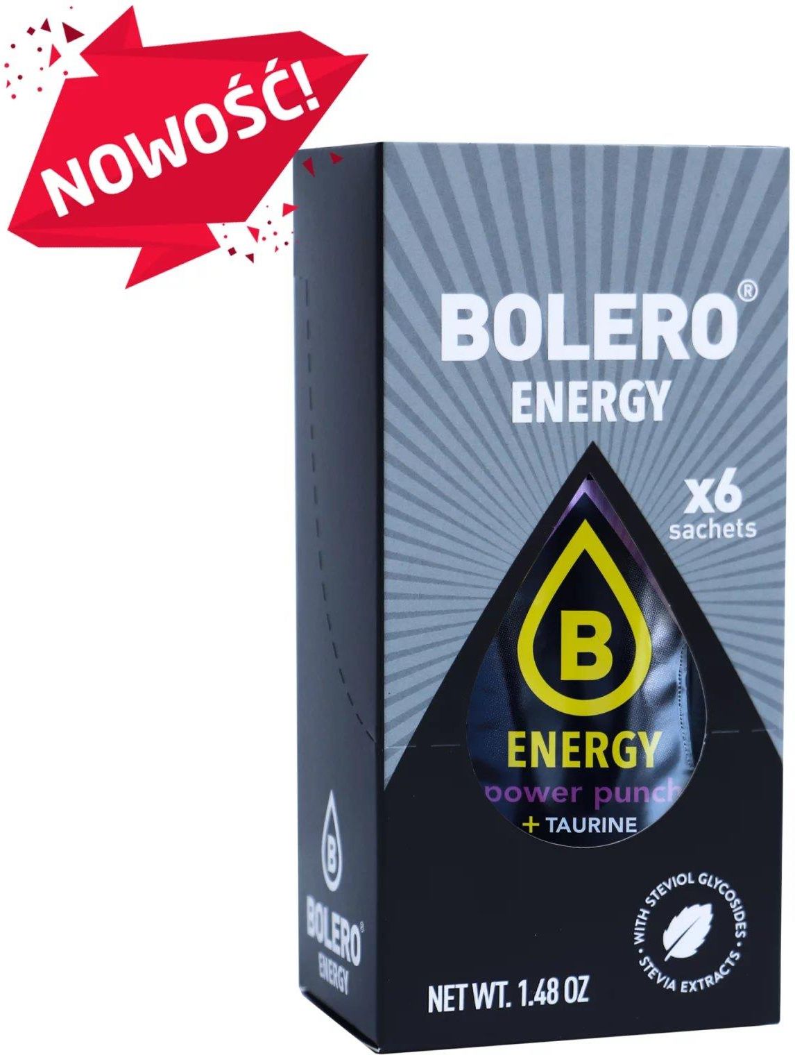 BOLERO 7g 6szt ENERGY POWER PUNCH - PROSZEK DO PRZYGOTOWANIA NAPOJU ENERGETYCZNEGO ZE SŁODZIKAMI NIE ZAWIERA CUKRU WYSOKA ZAWARTOŚĆ KOFEINY (32MG/ 100ML) NIE ZALECA SIĘ SPOŻYWAĆ DZIECIOM, KOBIETOM W CIĄŻY I KARMIĄCYM PIERSIĄ ZAWARTOŚĆ ROZPUŚCIĆ W 250 ML -500 ML WODY SKŁADNIKI KWASY: KWASEK CYTRYNOWY; EKSTRAKT Z ASHWAGANDHY (4,3%); SUBSTANCJA SPULCHNIAJĄCA: WODOROTLENEK SODU; REGULATOR KWASOWOŚCI: CYTRYNIAN SODU; TAURYNA (14,3%); EKSTRAKT Z NASION GUARANY; SUBSTANCJE SŁODZĄCE: GLIKOZYDY STEWIOLOWE ZE STEWI, SUKRALOZA, ACESULFAM K; NATURALNA KOFEINA(0,9%); WITAMINY: NIKOTYNAMID (NIACYNAb3), D-PANTOTENIAN, WAPŃ (KWAS PANTOTENOWY), CHLOROWODOREK PIRYDOKSYNY (WITAMINA B6); CYJANOKOBALAMINA (WITAMINA B12); AROMATY; SUBSTANCJA PRZECIWZBRYLAJĄCA: FOSFORAN WAPNIA BARWNIK: KONCENTRAT MARCHWI; WŁÓKNO INULINOWE. WARTOŚCI ODŻYWCZE NA 100 ml: WARTOŚĆ ENERGETYCZNA 24 kJ / 6 kcal TŁUSZCZ 0 g - W TYM KWASY TŁUSZCZOWE NASYCONE 0 g WĘGLOWODANY 0 g - W TYM CUKRY 0 g BIAŁKO 0 g SÓL 0,54 mg NIACYNA 7,2 mg NE (45% NRV*) KWAS PANTOTENOWY 1,8 mg (30% NRV*) WITAMINA B6 1,3 mg (93% NRV*) WITAMINA B12 2 µg (80% NRV*) *7,5% RWS – REFERENCYJNA WARTOŚĆ SPOŻYCIA. Podane wartości dotyczą porcji przygotowanej w 250 ml wody. DATA PRZYDATNOŚCI DO SPOŻYCIA ZNAJDUJE SIĘ NA WIERZCHU OPAKOWANIA. MASA NETTO: 7 g / 0.25 oz WYPRODUKOWANE PRZEZ BOLERO & Co. Ltd., 1 BOLERO STR. 2180 ETROPOLE, BULGARIA, EUROPEAN UNION WZBOGACONA FORMUŁA BOLERO ENERGY POWER PUNCH Ashwagandha jest skutecznym adaptogenem, który pomaga organizmowi radzić sobie ze stresem, poprawiając ogólną odporność psychiczną i fizyczną, a także wspierając zdrowy sen i równowagę hormonalną. Tauryna, poprzez swoje działanie wspomagające funkcjonowanie serca i układu krążenia, a także poprawiające koncentrację, przyczynia się do lepszej wydolności fizycznej i umysłowej. Witaminy z grupy B są kluczowe dla przetwarzania składników odżywczych na energię, wspierając metabolizm, funkcje neurologiczne, a także zdrowie skóry i włosów, co wpływa na ogólne samopoczucie i witalność. BOLERO 7g 6szt ENERGY POWER PUNCH ZE STEWIĄ Bolero Energy Power Punch to produkt stworzony z myślą o osobach, które potrzebują dodatkowej dawki energii w ciągu dnia, a jednocześnie cenią sobie wyraziste, owocowe smaki. Mianowicie idealnie łączy w sobie działanie starannie dobranych składników aktywnych z intensywnym, orzeźwiającym smakiem wiśni przełamanym delikatnym akcentem cytryny. Dzięki temu, Bolero Energy Power Punch nie tylko skutecznie dodaje energii, ale także dostarcza niezapomnianych wrażeń smakowych. Dodatkowo wygodna forma proszku sprawia, że napój można przygotować w dowolnym miejscu, co czyni go idealnym towarzyszem w pracy, na treningu czy podczas podróży. Przede wszystkim Bolero Energy Power Punch to produkt, który jest całkowicie wolny od cukru, a jego słodycz pochodzi z naturalnej stewii. Dodatkowo nie zawiera konserwantów ani sztucznych barwników, co czyni go bezpiecznym wyborem dla osób dbających o zdrowie i jakość swojej diety. Skład Bolero 7g 6szt Energy Power Punch Przede wszystkim Bolero Energy Power Punch zawiera kilka kluczowych składników, które wspólnie działają na korzyść organizmu, zapewniając energię i wsparcie w codziennych wyzwaniach. Pierwszym z nich jest tauryna w ilości 1 g na porcję. Tauryna to aminokwas, który odgrywa istotną rolę w funkcjonowaniu układu nerwowego oraz mięśniowego. Przede wszystkim jest znana z tego, że wspomaga transport elektrolitów w organizmie, co przyczynia się do lepszej wydolności fizycznej oraz szybszej regeneracji po wysiłku. Tauryna działa również jako antyoksydant, pomagając chronić komórki przed stresem oksydacyjnym, co ma kluczowe znaczenie dla zachowania zdrowia na dłuższą metę. Ashwagandha jest adaptogenem znanym ze swoich właściwości redukujących stres i wspierających odporność organizmu na różnego rodzaju obciążenia. Poza tym ashwagandha pomaga również w poprawie wydolności fizycznej i psychicznej, co czyni ją idealnym składnikiem napojów energetycznych przeznaczonych dla osób aktywnych. Działa również kojąco na układ nerwowy, wspomagając jednocześnie odporność na stres i poprawiając ogólne samopoczucie. Kolejnym ważnym składnikiem są witaminy z grupy B, które odgrywają kluczową rolę w procesach metabolicznych organizmu. Dodatkowo witaminy te wspomagają przekształcanie węglowodanów w energię, co jest niezbędne do utrzymania odpowiedniego poziomu energii w ciągu dnia. Ponadto, witaminy z grupy B wspierają funkcjonowanie układu nerwowego, pomagając utrzymać koncentrację i dobrą kondycję psychiczną. Bolero 7g 6szt Energy Power Punch - owocowy zastrzyk energii z nutą cytryny! Pod względem smakowym, Bolero Energy Power Punch oferuje wyjątkowe doznania. W rzeczywistości charakteryzuje się intensywnym, owocowym smakiem, w którym wyraźnie wyczuwalna jest słodycz dojrzałej wiśni, przełamana orzeźwiającą nutą cytryny. Z pewnością ten zrównoważony smak sprawia, że napój jest smaczny i idealnie sprawdzi się w sytuacjach, kiedy potrzebujesz zastrzyku energii. Dzięki naturalnemu słodzeniu stewią, nie tylko dostarcza energii, ale również pozwala cieszyć się słodkim smakiem bez obaw o zbędne kalorie. Niewątpliwie, Bolero Energy Power Punch wyróżnia się na tle innych produktów na rynku. Dzięki unikalnej kompozycji składników aktywnych, takich jak tauryna, witaminy z grupy B, ashwagandha oraz kofeina. Niewątpliwie te składniki skutecznie wspierają organizm zarówno pod względem fizycznym, jak i psychicznym. Ponadto jego intensywny, owocowy smak, oraz brak cukru, konserwantów i sztucznych barwników czynią go doskonałym wyborem dla osób poszukujących zdrowych, a zarazem smacznych rozwiązań energetycznych. Tak więc, spróbuj Bolero Energy Power Punch i odkryj, jak łatwo można połączyć przyjemno