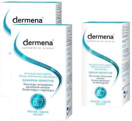 Zestaw kosmetyków Dermena do pielęgnacji wrażliwej skóry głowy oraz włosów nadmiernie wypadających: 2x szampon + serum.