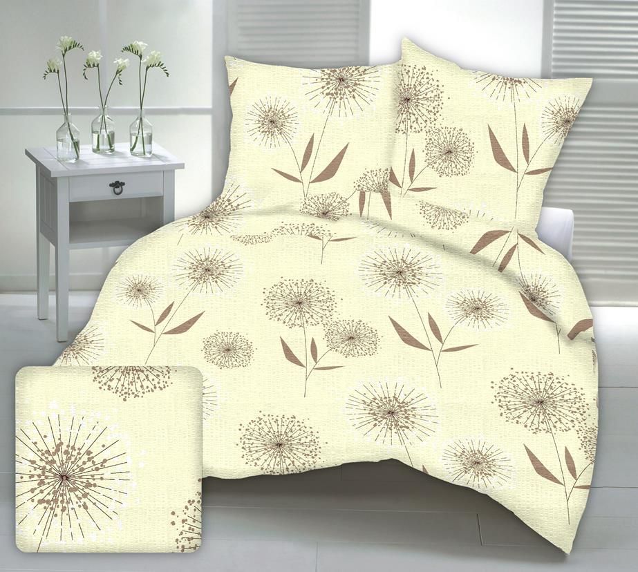 Pościele z kory stworzone są z myślą o osobach praktycznych, ceniących sobie wygodę. Wykonane są ze 100% bawełny o najwyższej jakości. Są przewiewne i delikatne dla ciała. W trakcie nawet dłuższego użytkowania pościel nie traci kolorów oraz zachowuje swój kształt i rozmiar. Największym jej atutem jest to, iż nie wymaga prasowania. Zachowuje trwałość i świeżość przez długi czas. Prezentowany komplet posiada ciekawy, estetyczny wzór beżowych dmuchawców na kremowym tle. Poszwa na kołdrę i poszewki na poduszki zapinane są na praktyczny ekspres. W skład zestawu wchodzą poszwa na kołdrę 160 x 200, dwie poszewki na poduszkę 70 x 80. Długość: 200 cm, Szerokość: 160 cm Skład surowcowy: 100% bawełna (kora) Gramatura: 140 GSM Zdjęcie główne zostało wygenerowane komputerowo. Pojawiające się różnice mogą wynikać z indywidualnych ustawień monitora.