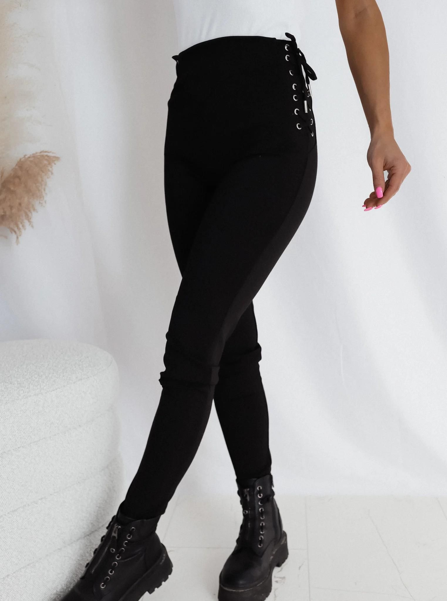 Legginsy z efektownym wiązaniem po boku i srebrnymi kółeczkami. Model z grubszego, elastycznego materiału z wyższym stanem. Idealnie modelują sylwetkę! Dostępne w dwóch rozmiarach. Skład: 15% bawełna, 85% elastan. Rozmiar S/M: Długość całkowita: 102 cm Długość od kroku: 74 cm Stan: 30 cm Pas: 64 cm do 84 cm Biodra: 84 cm do 104 cm Rozmiar M/L: Długość całkowita: 102 cm Długość od kroku: 74 cm Stan: 30 cm Pas: 68 cm do 88 cm Biodra: 88 cm do 108 cm Wymiary mierzone na płasko, +/- 2 cm. Legginsy z wysokim stanem