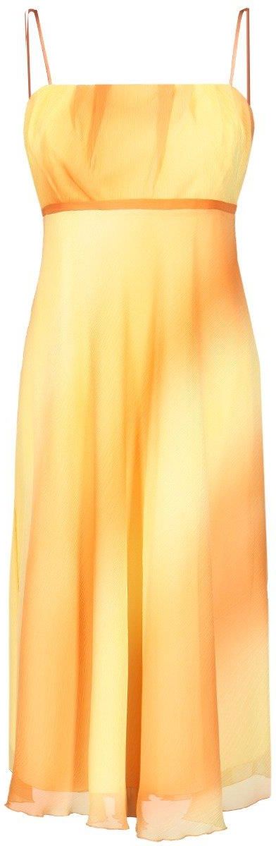 Fason: empire Dekolt przód: prosty Plecy: odkryte częściowo Zapięcie: suwak kryty z boku Materiał: tkanina zwiewna - szyfon, podszewka Długość całkowita: midi Rękaw: wąskie regulowane ramiączka