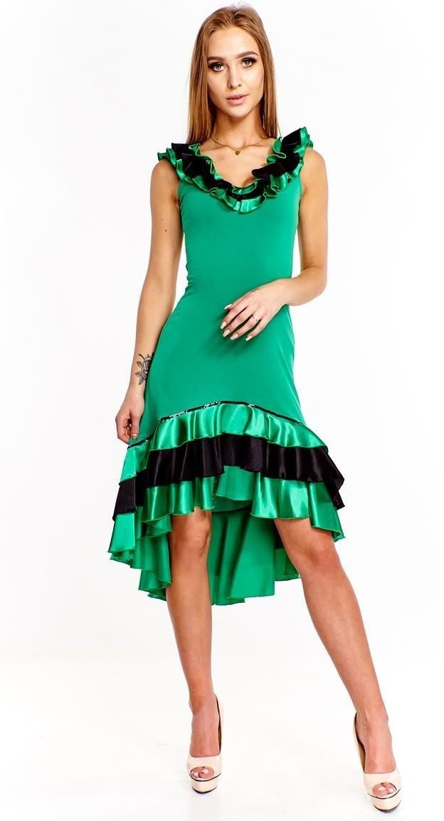 Fason: rozkloszowana, falbany Dekolt przód: serek Plecy: dekolt serek Zapięcie: brak Materiał: dzianina - jersey, satyna Długość całkowita: midi Rękaw: brak Ozdoby: cekiny
