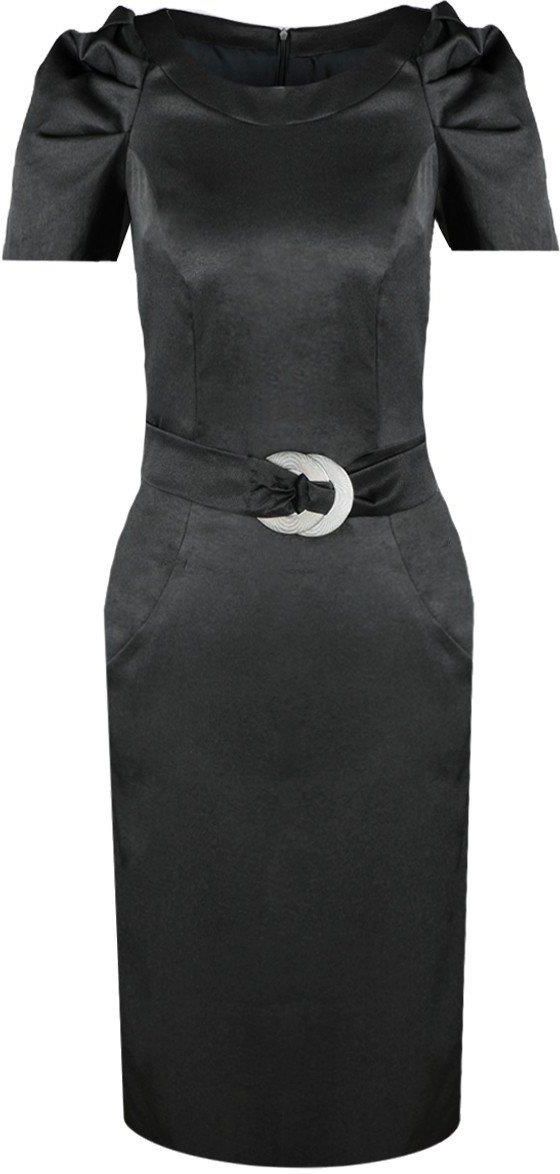 Fason: prosta, rozporek z tyłu Dekolt przód: okrągły Plecy: zabudowane Zapięcie: suwak kryty z boku Materiał: tkanina z połyskiem, podszewka Długość całkowita: midi Rękaw: krótki Ozdoby: klamra