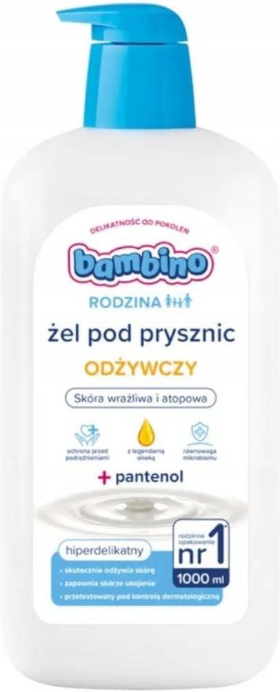 BAMBINO ŻEL POD PRYSZNIC HIPERDELIKATNY Z PANTENOLem 1000 ML Odkryj moc odżywczego żelu pod prysznic BAMBINO i zafunduj swojej skórze wyjątkowe doznania! Stworzony z myślą o wrażliwej skórze, nasz żel to idealne rozwiązanie dla całej rodziny, zapewniające nie tylko skuteczne oczyszczenie, ale także nawilżenie i ochronę przed podrażnieniami. Nasza hiperdelikatna formuła wzbogacona o pantenol i oliwkę to prawdziwy skarb w łazience! Przy regularnym stosowaniu poczujesz, jak Twoja skóra staje się gładka i miękka w dotyku. Idealny wybór, jeżeli szukasz produktu, który zapewni komfort nawet przy najdelikatniejszej skórze. Przeznaczony dla dzieci od 3. roku życia Przebadany dermatologicznie i okulistycznie 93% składników pochodzenia naturalnego Nie zawiera mikroplastiku Używając żelu BAMBINO, możesz być pewny, że Twoja skóra otrzymuje to, co najlepsze. Jego delikatne pH neutralne dla skóry sprawia, że jest on idealny nawet dla osób z atopowym zapaleniem skóry. Dzięki temu, możesz cieszyć się kąpielą bez obaw o podrażnienia czy uczucia suchości. Spraw, by każda kąpiel była chwila relaksu! Żel pod prysznic BAMBINO stworzy na Twojej skórze delikatną powłokę ochronną, która zredukuje ryzyko podrażnień. Już od pierwszego użycia doświadczysz nawilżającego efektu, który utrzyma się długo po zakończeniu kąpieli. Stwórz własny rytuał pielęgnacyjny w zaledwie kilku krokach: niewielką ilość żelu nałóż na wilgotną skórę lub dodaj do wanny, a następnie dokładnie spłucz. Efekt? Świeża, nawilżona skóra oraz uczucie odnowy. Oto skład produktu, który podkręci Twoje zmysły i zadba o Twoją skórę: Aqua, Sodium Myreth Sulfate, Cocamidopropyl Betaine, Glycerin, Sodium Chloride, Citric Acid, Sodium Cocoamphoacetate, Glycine Soja Oil, Panthenol, Pantolactone, Coco-Glucoside, Glyceryl Oleate, Tocopherol, Hydrogenated Palm Glycerides Citrate, Sodium Citrate, Sodium Benzoate, Parfum, Trimethylbenzenepropanol. Wybierz BAMBINO ŻEL POD PRYSZNIC HIPERDELIKATNY Z PANTENOLem i doświadcz codziennej przyjemności, jaką daje zadbana skóra. Kup teraz i przekonaj się, jak niewiele potrzeba, by poczuć się lepiej! Na tej aukcji oferujemy ORYGINALNE BAMBINO ŻEL POD PRYSZNIC HIPERDELIKATNY Z PANTENOLem 1000 ML zawsze w dobrej cenie. Autentyczność i Jakość Gwarantowane! Nasza drogeria oferuje wyłącznie oryginalne produkty! Unikaj podróbek, które mają niewiadomy skład, pochodzenie i mogą powodować uczulenia i choroby skóry!. Zaufaj Profesjonalizmowi i Doświadczeniu Dziękujemy za zaufanie i zapraszamy do dalszych zakupów w naszym sklepie, gdzie gwarantujemy autentyczność, jakość i obsługę na najwyższym poziomie. Dołącz do grona zadowolonych klientów!