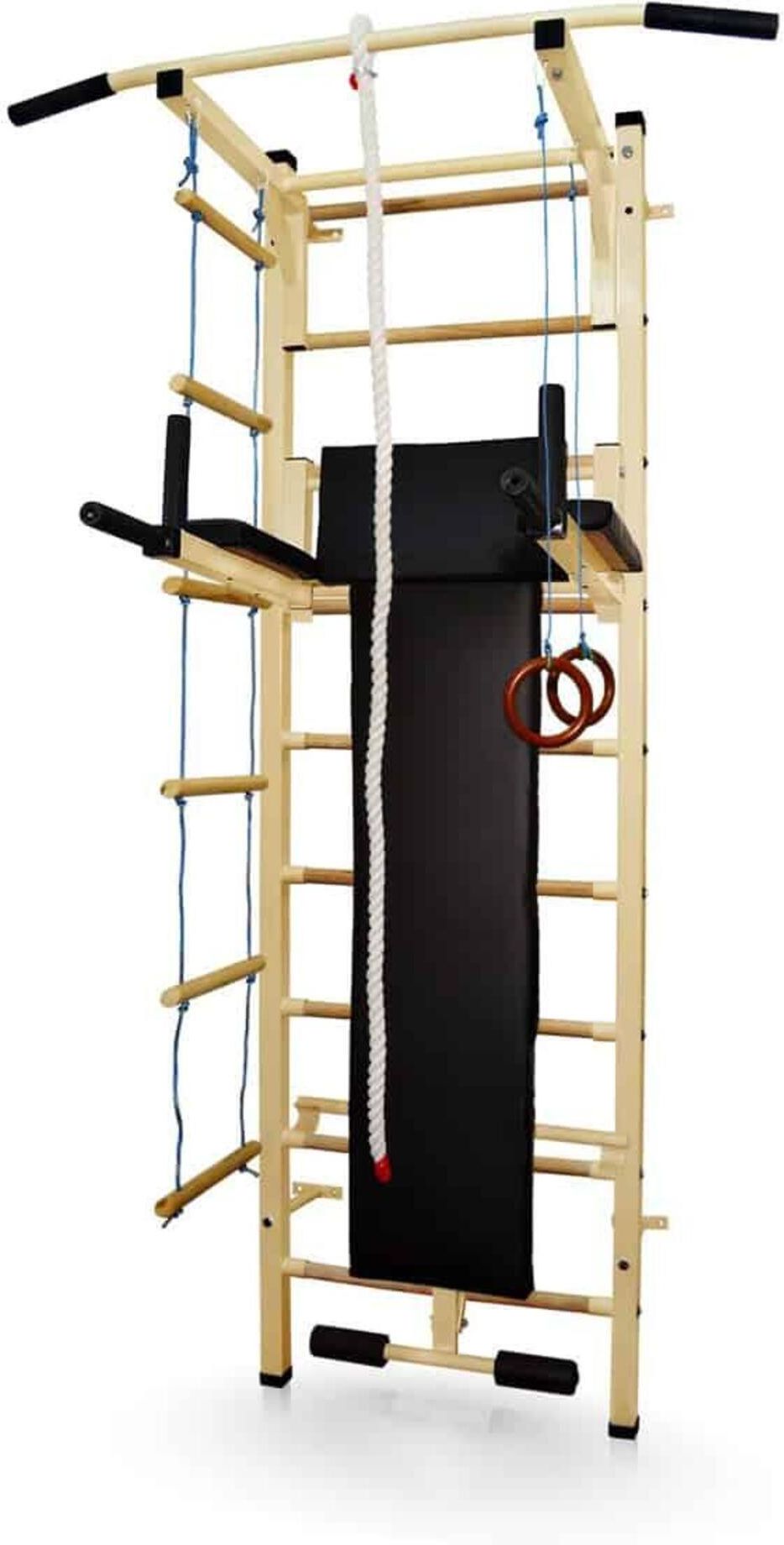 Drabinka gimnastyczna do ćwiczeń beżowa Maximus Plus Zestaw zawiera: metalowa drabinka do ćwiczeń, ławka treningowa, poręcze zawieszane, drążek przesuwny, lina gimnastyczna bawełniana, drabinka linowa, kółka gimnastyczne Producent: Małpiszon Kod producenta: 01.070.24.001 EAN: 5908271396271 Stan: Nowy, oryginalny produkt Kolor/Wzór: beżowy Drabinka gimnastyczna do ćwiczeń czarna Maximus Plus Drabinka gimnastyczna Maximum Plus daje korzyści całej rodzinie! W przerwie pomiędzy zajęciami można wykonać podciąganie na drążku, pompki na poręczach czy trening brzucha. W zestawie znajduje się również ławka treningowa, która jest nieodzownym elementem domowej siłowni. Drewniane szczebelki zostały wzmocnione metalowymi elementami. Drabinka wytrzymuje obciążenie do 120 kg. Warto również rozważyć zakup materaca gimnastycznego. Takie rozwiązania zapewniają dzieciom bezpieczeństwo. Drabinka gimnastyczna Maximum Plus uczy dzieci zdrowych nawyków. Najmłodsi mogą zwiększać swoją sprawność, rozwijać motorykę dużą i małą, wzmacniać centralny układ nerwowy, a także poprawiać elastyczność mięśni oraz kręgosłupa. To również doskonała okazja dla rodziny do wspólnego spędzania czasu na rozwijającej zabawie oraz aktywności fizycznej. ELEMENTY ZESTAWU metalowa drabinka do ćwiczeń ławka treningowa poręcze zawieszane drążek przesuwny lina gimnastyczna bawełniana drabinka linowa kółka gimnastyczne WAZNE Zestaw przeznaczony dla dzieci od 3 lat i dorosłych Wysokość całkowita: 230 cm Wysokość do drążka: 210 cm Szerokość drążka: 115 cm Szerokość drabinki: 66 cm Głębokość od ściany do końca drążka: 69 cm Odłęgłość od ściany do słupka drabinki: 15 cm Profil słupka: 4 x 4 cm Długość ławki do ćwiczeń: 140 cm Szerokość ławki do ćwiczeń: 30 cm Szerokość poręcza: 58 cm Montaż: przyścienny Kolorystyka: biały, czarny Dopuszczalne obciążenie:120 kg (metalowa konstrukcja), 80 kg (akcesoria zawieszane) Zalecenia: dzieci od 3 do 7 lat powinny ćwiczyć tylko pod nadzorem rodziców Uwaga! Dla bezpieczeństwa ćwiczeń zalecany jest zakup materaca gimnastycznego